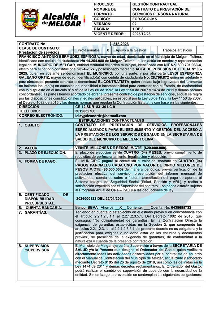 Y es que de manera pública se conoció en las últimas horas el contrato 515 del 2026, apoyo a la gestión, por medio del cual se le asignan 20 millones de pesos a la señora Leidy Esperanza Galeano Ortiz, para que preste sus servicios especializados de seguimiento y gestión del acceso a la prestación de los servicios en salud en la Secretaría de la salud en Melgar. Que podrá hacer la señora Leidy, teniendo en cuenta que la crisis de la salud es nacional.
