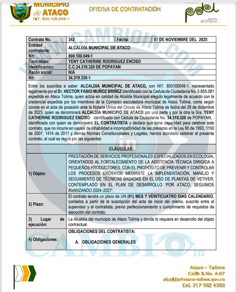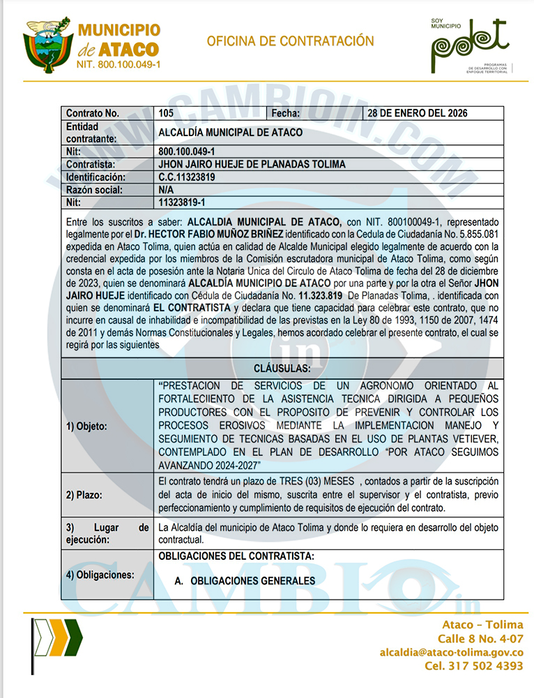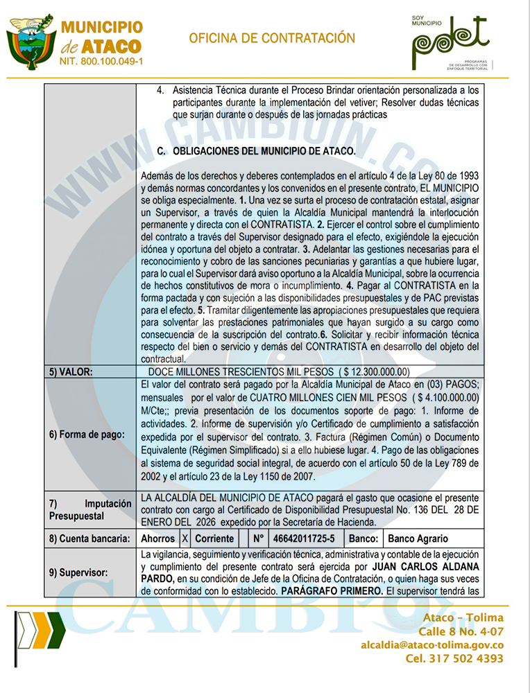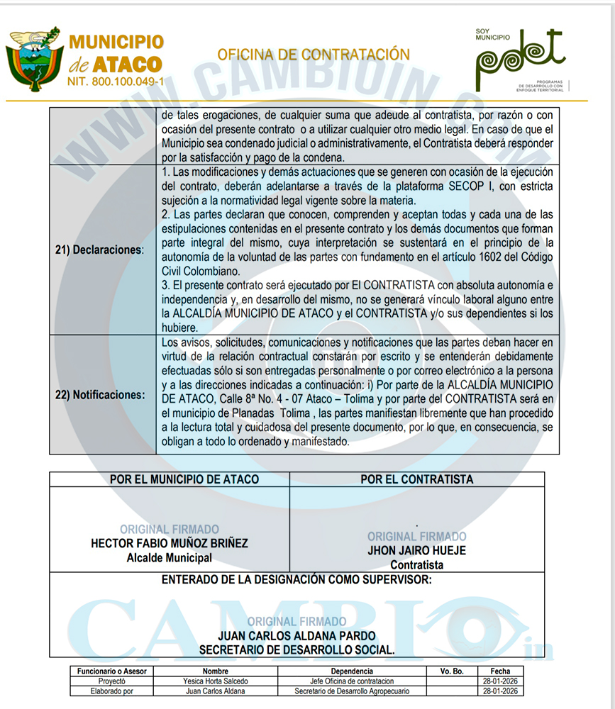 La denuncia fue enviada a la Procuraduría General de la Nación, porque esta conducta podría estar tipificada como una falta gravísima disciplinaria, qué podría terminar afectando al alcalde de Ataco, con una destitución por ser la persona qué firma los contratos.