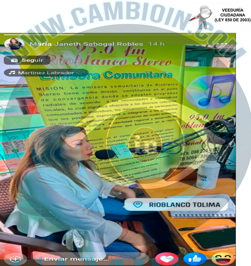 16. La señora María Janeth Sabogal Robles también se presenta en emisoras del territorio sur del Tolima, específicamente la emisora RIOBLANCO STEREO CON NIT. 860.001.022-7, la cual se adjunta evidencia fotográfica de la red social Facebook de la mencionada, violando así la resolución 2581 del 05 de marzo de 2025 del Consejo Nacional Electoral la cual indica que a partir del 10 de diciembre de 2024 se puede iniciar propaganda electoral a través de medios de comunicación social, ART 35 de la ley estatutaria 1475 de 2011