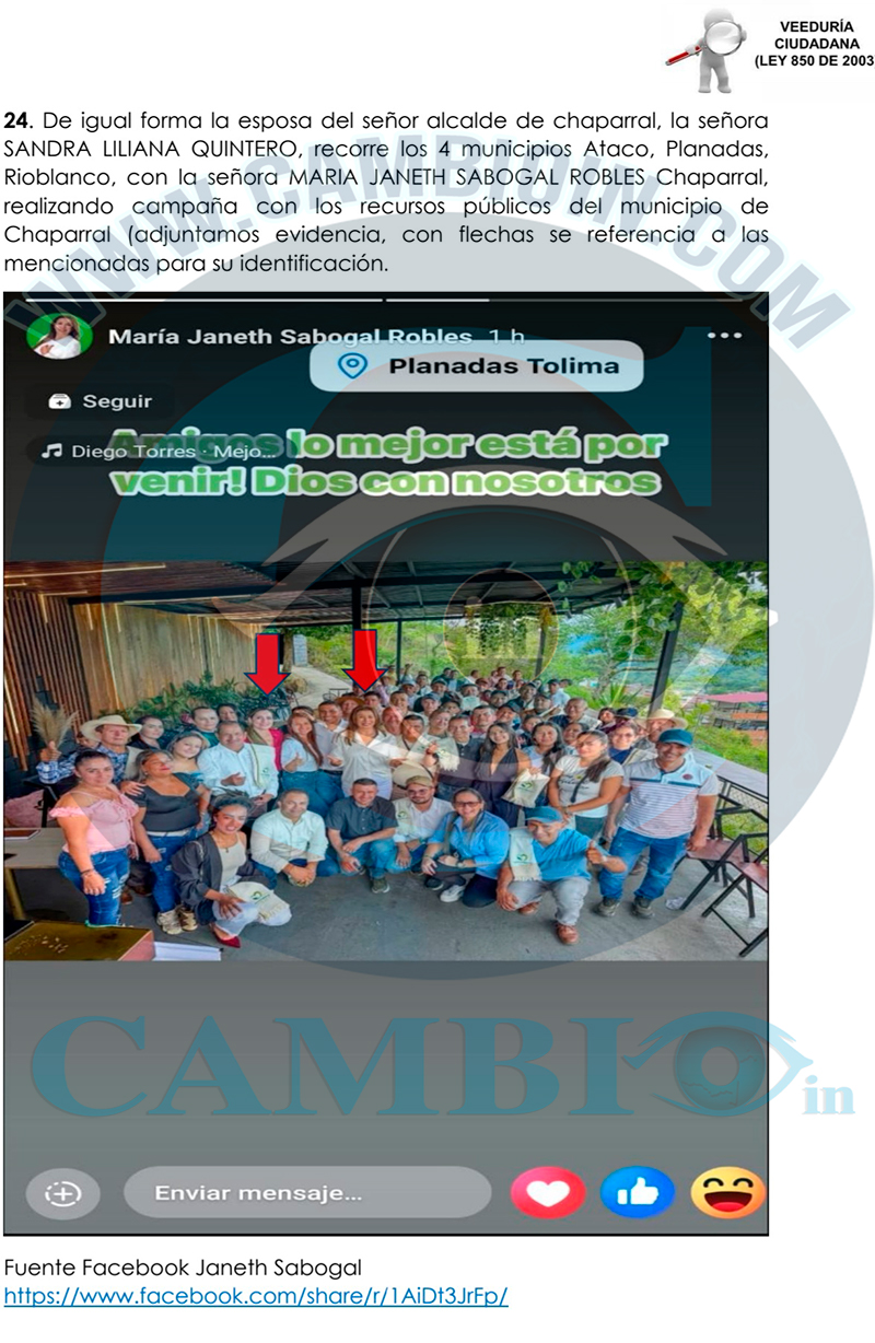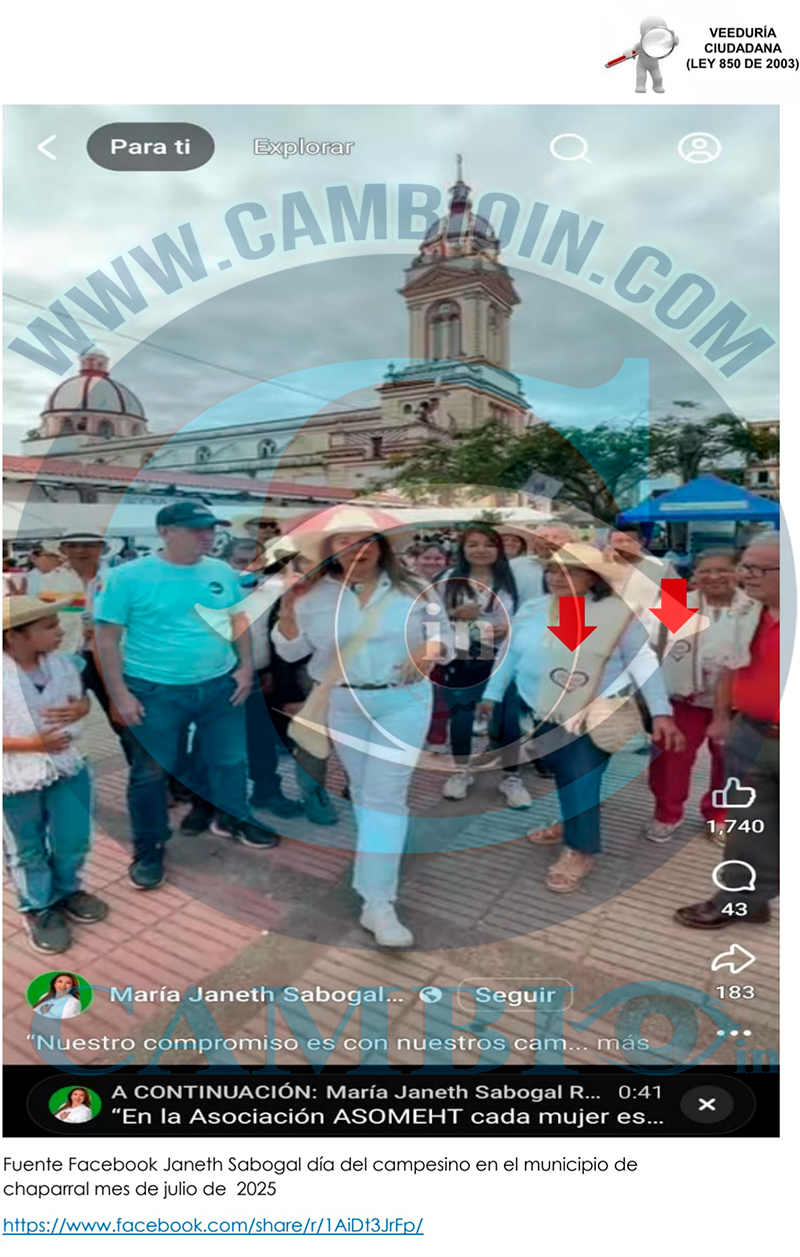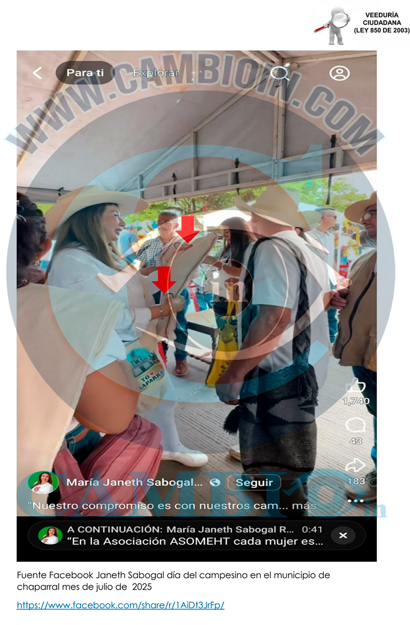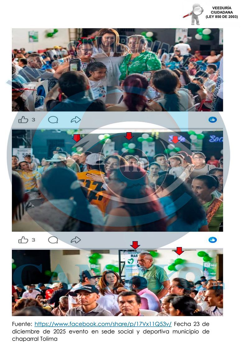 14. Un hecho específico el día 02 de noviembre de 2025 en el municipio de Chaparral corregimiento del limón se evidencio que el alcalde Elvert González Mora. La representante a la Cámara Delcy Esperanza Isaza actual y candidata al periodo 2026-2030 por el partido conservador acompañaban a la señora María Janeth Sabogal Robles realizando proselitismo político donde utilizan su poder para presionar a particulares o subalternos a respaldar una causa o campaña política o influir en procesos electorales de carácter partidista. En este caso violan el acto legislativo Acto Legislativo 02 de 2021 específicamente el siguiente artículo
