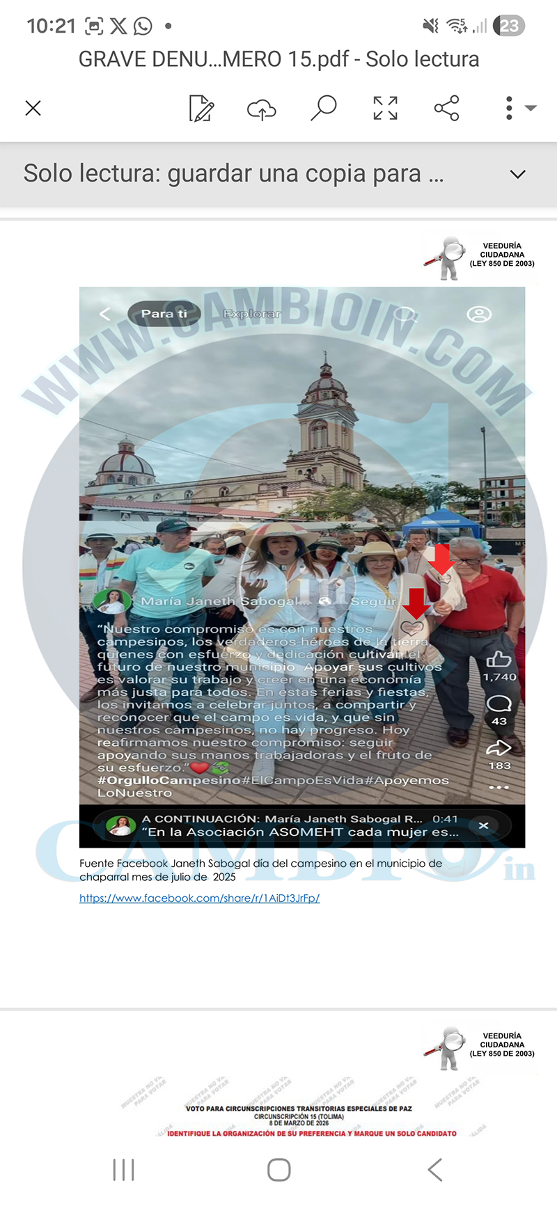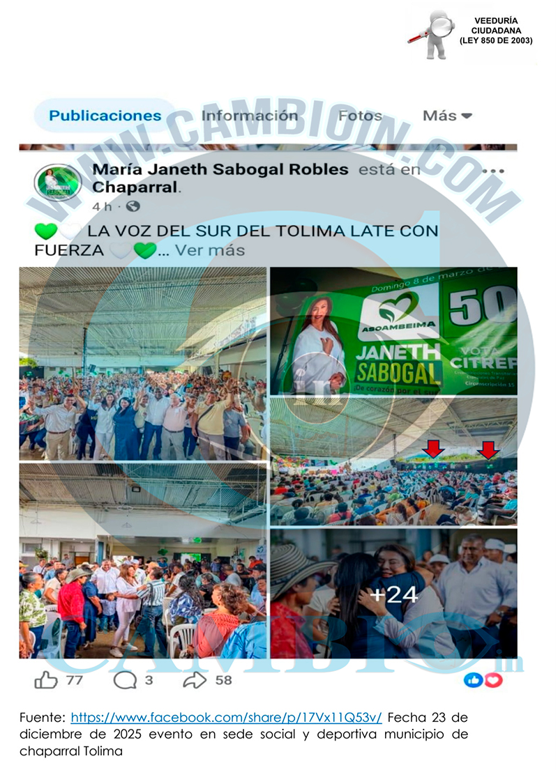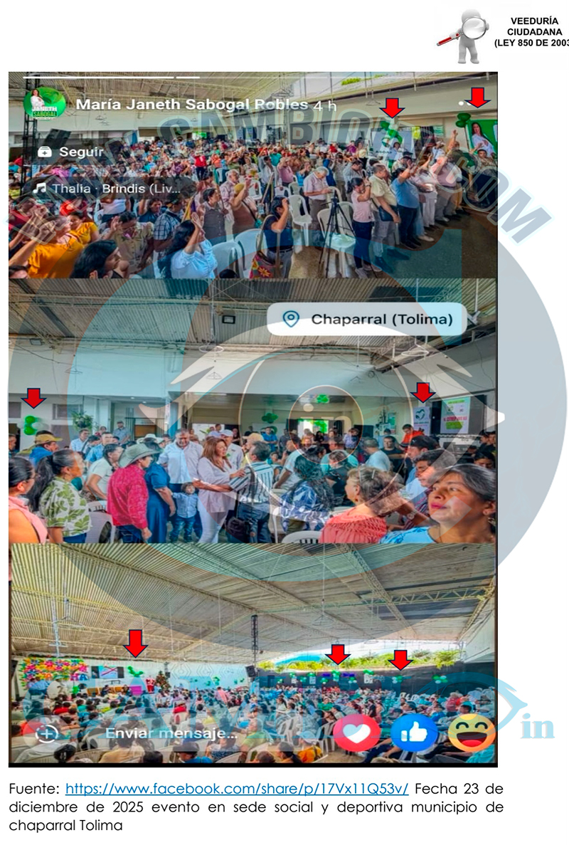 14. Un hecho específico el día 02 de noviembre de 2025 en el municipio de Chaparral corregimiento del limón se evidencio que el alcalde Elvert González Mora. La representante a la Cámara Delcy Esperanza Isaza actual y candidata al periodo 2026-2030 por el partido conservador acompañaban a la señora María Janeth Sabogal Robles realizando proselitismo político donde utilizan su poder para presionar a particulares o subalternos a respaldar una causa o campaña política o influir en procesos electorales de carácter partidista. En este caso violan el acto legislativo Acto Legislativo 02 de 2021 específicamente el siguiente artículo