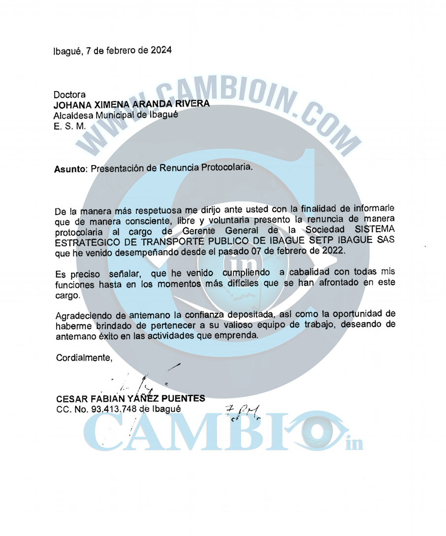 Claramente señala este documento que el gerente del Sistema Estratégico de Transporte Público de Ibagué o SETP por su sigla César Fabián Yañez Puentes, debía haber renunciado ante la junta directiva de la sociedad, y no ante la alcaldesa como efectivamente lo hizo. (Copia de la carta de renuncia dirigida a la alcaldesa de Ibagué)