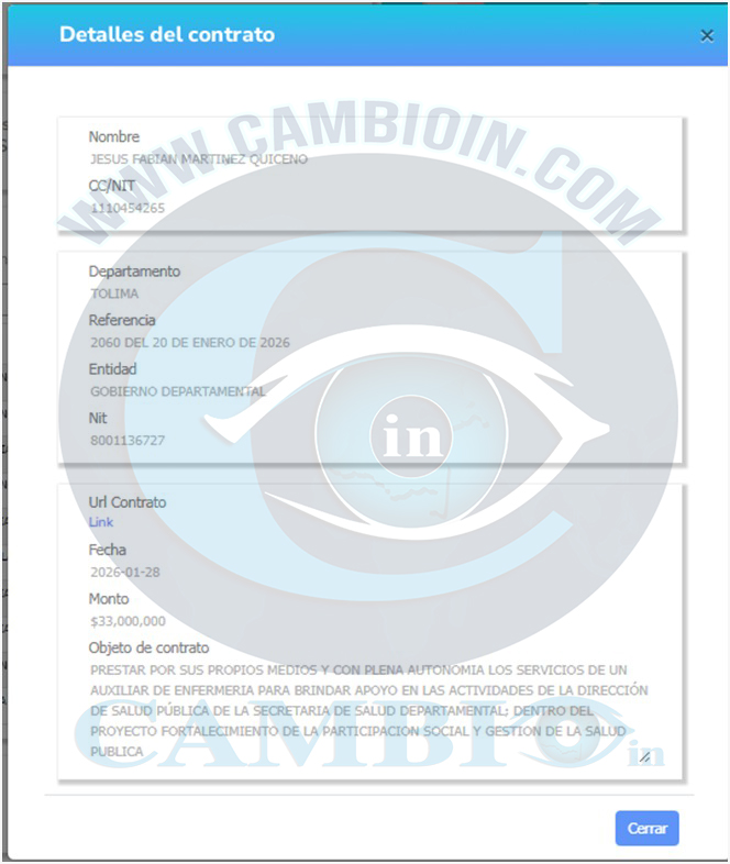 El señor Quiceno Martínez, luego de llegar a ese cargo, el mismo que aspira a repetir, se le arreglo su vida porque con un nivel técnico de estudio fue contratado en la Gobernación del Tolima, por 33 millones de pesos, para hacer un trabajo muy sencillo en la secretaría de salud.