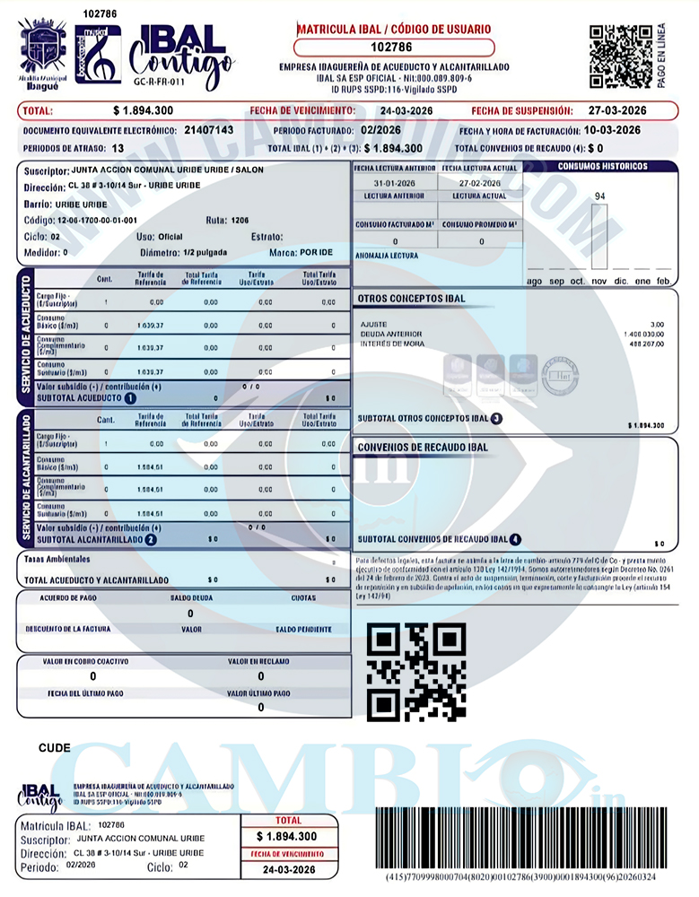 Copia 3: Recibo del Agua del salón comunal del Barrio Uribe Uribe, en deuda. cambioin.com
