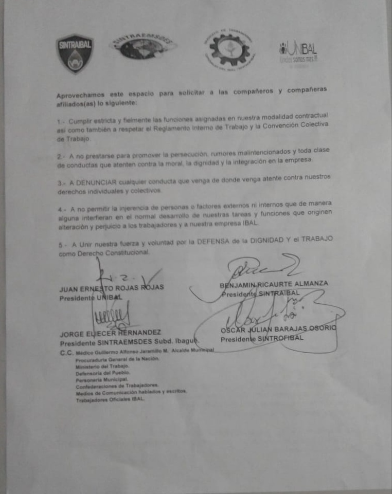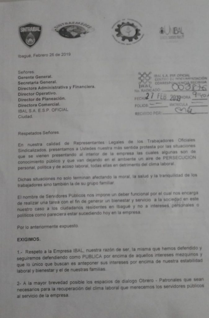 Juan Ernesto Rojas Rojas, presidente Unibal, Benjamín Ricaurte Almanza, Presidente Sintraibal, Jorge Eliecer Hernández, presidente de sintraemsdes subd Ibagué y Oscar Julián Barajas Osorio, presidente sintrofibal, enviaron un documento a los directivos del IBAL y a los organismos de control del estado, para poner al descubierto las presiones indebidas, el acoso laboral y persecución, ejercidas al interior del instituto descentralizado de la alcaldía de Ibagué, para someter al personal a favor de una campaña política, lo que es ilegal.