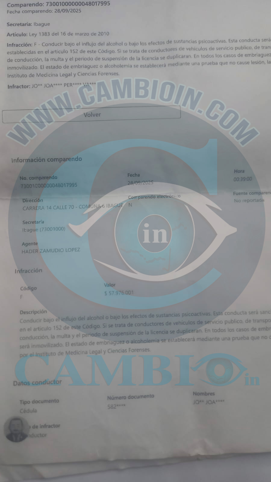 Copia 1: Comparendo impuesto por Agente de Tránsito Ibagué, sin confirmar a quién se lo hizo. Exclusivo cambioin.com