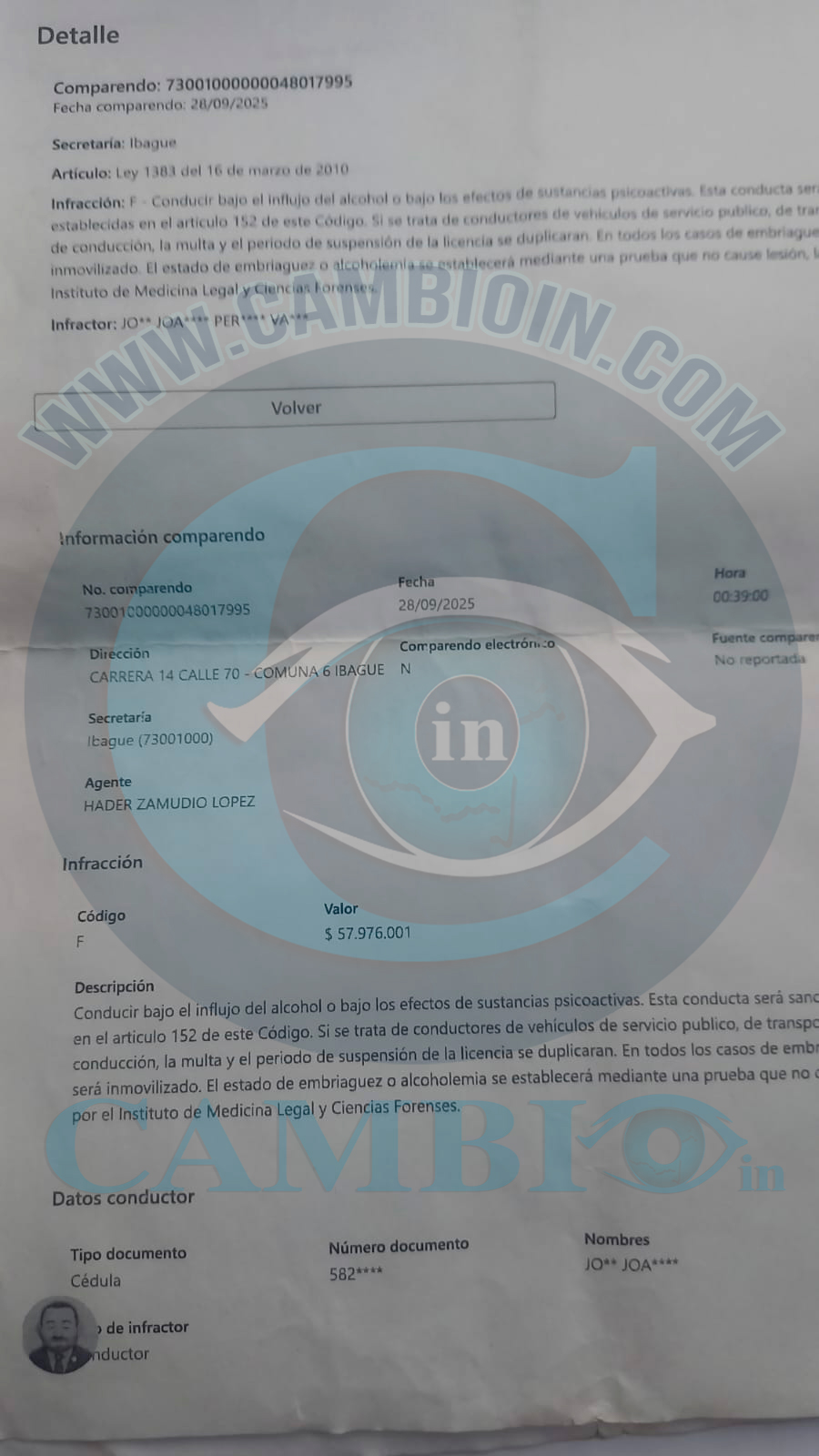 Este es el nuevo abuso de la Secretaría de Movilidad y Tránsito de Ibagué. Uno de sus agentes azules, le impuso una multa de 57 millones de pesos, supuestamente a una persona que conducía en estado de embriaguez, lo curioso del caso es que en el mismo comparendo dice que el señor se dio a la fuga, y sin contar con su documento de identidad hizo el procedimiento con un número de identificación del cual el funcionario de la alcaldía de Ibagué, no aporta prueba de donde lo saco, pero asegura que ese era el infractor. La cédula resultó ser de una persona que estaba muy lejos del lugar donde se adelantó el procedimiento, y con videos del conjunto residencial donde vive hace varios años, demostró que hacía varias horas antes del caso registrado, él ya había ingresado a su apartamento donde se encontraba durmiendo junto a su familia. Pese a las pruebas la alcaldía dice que debe pagar, y su licencia le fue suspendida.