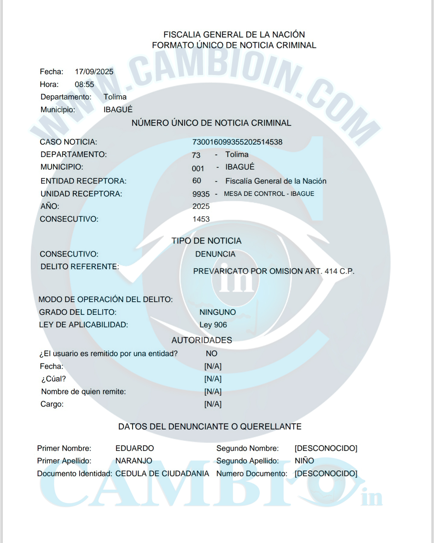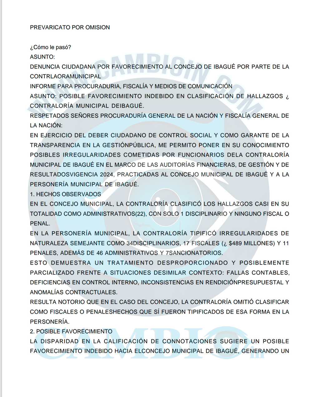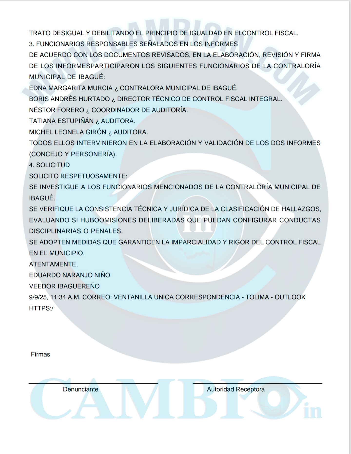 Sobre le particular, el denunciante de estos hechos, envíe el siguiente escrito a cambioin.com el portal de las noticias: "Gracias al respaldo decidido y a la valentía del medio de comunicación Cambio In, así como al ejercicio constante de veeduría ciudadana en materia de control fiscal, la Fiscalía General de la Nación tomó la determinación de abrir una investigación formal sobre los hechos relacionados con el presunto favorecimiento al Concejo Municipal de Ibagué y la persecución administrativa ejercida en contra de la Personería Municipal de Ibagué por parte de la Contraloría Municipal de Ibagué.