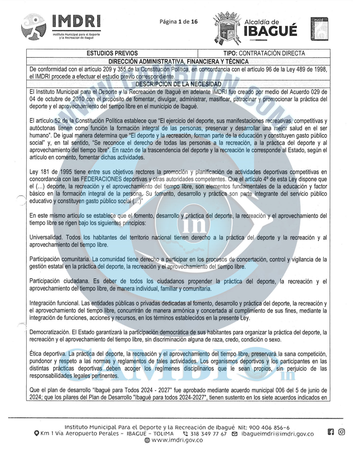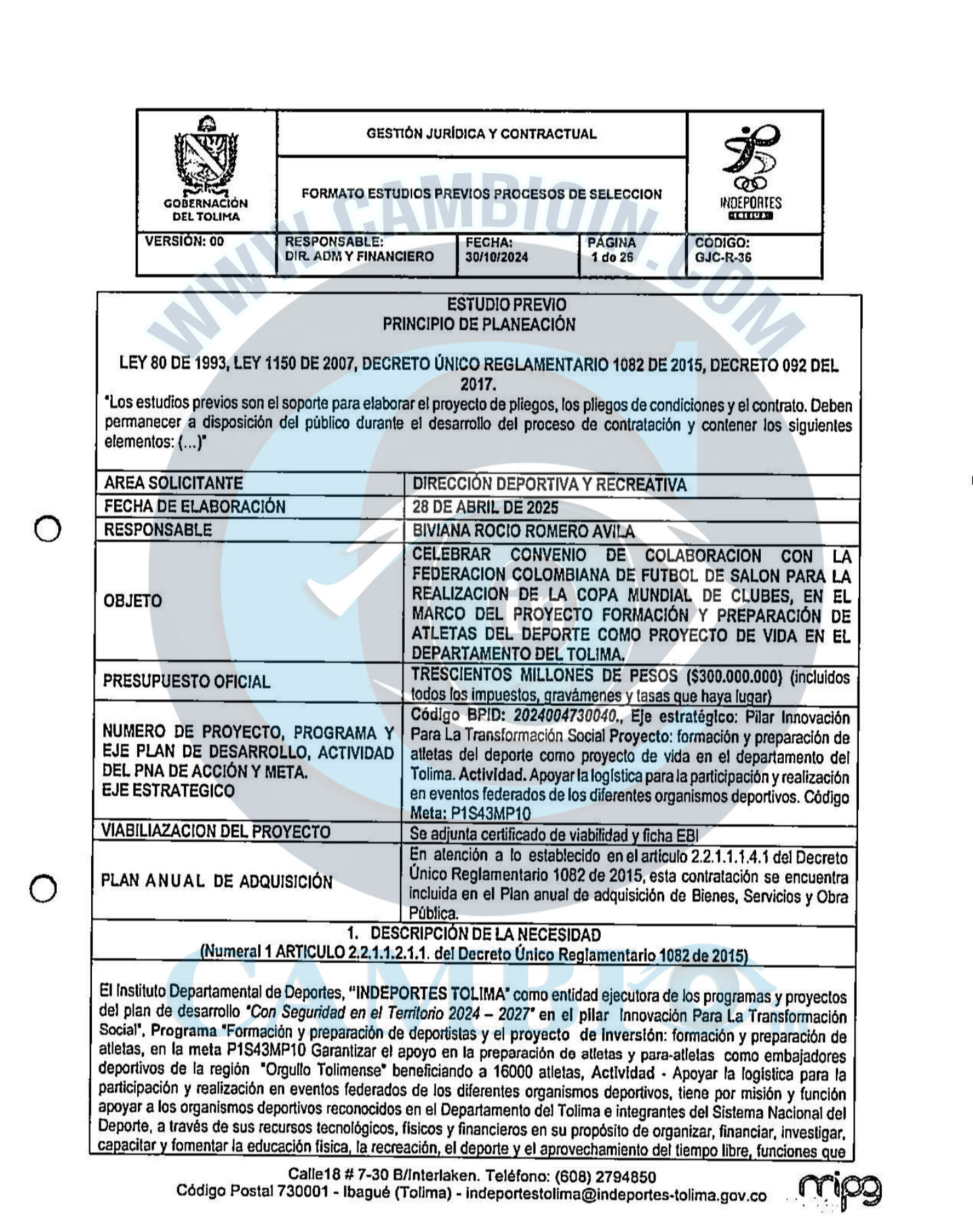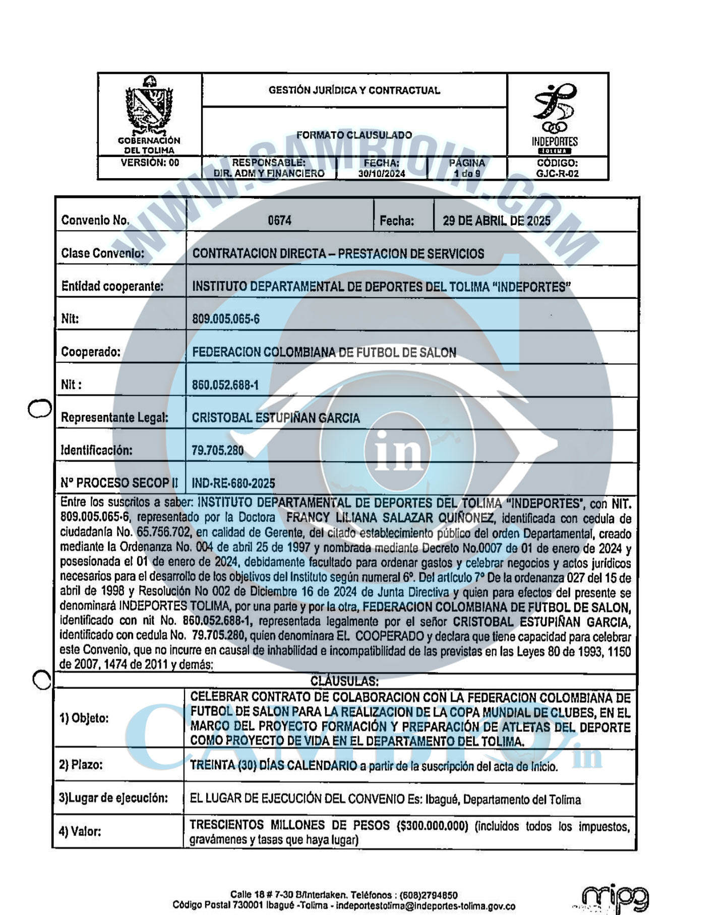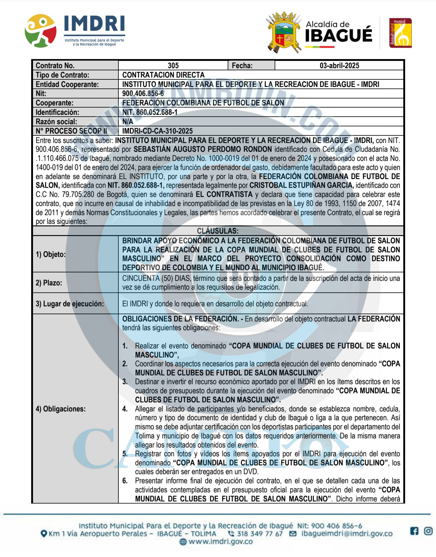 Segundo: El primero de dichos instrumentos corresponde al Convenio No. 305 de 2025, suscrito entre el Instituto Municipal para el Deporte y la Recreación de Ibagué – IMDRI y la Federación Colombiana de Fútbol de Salón, cuyo objeto contractual se dirigió a la realización y desarrollo integral de un evento deportivo de esta disciplina.