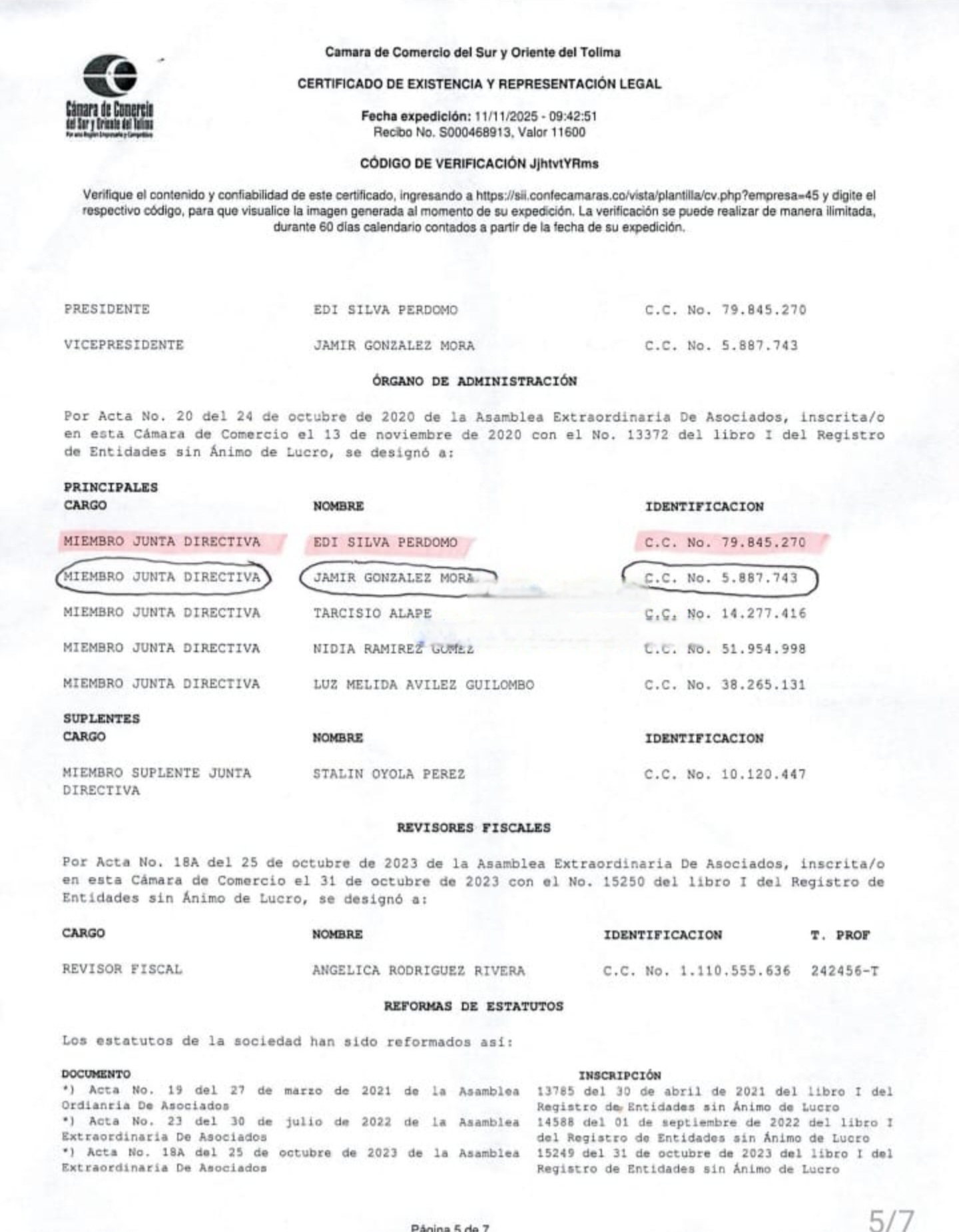 Copia 1: Registro de Cámara de Comercio de la cooperativa de café, de Edi Silva Perdomo y Jamir González Mora. cambioin.com