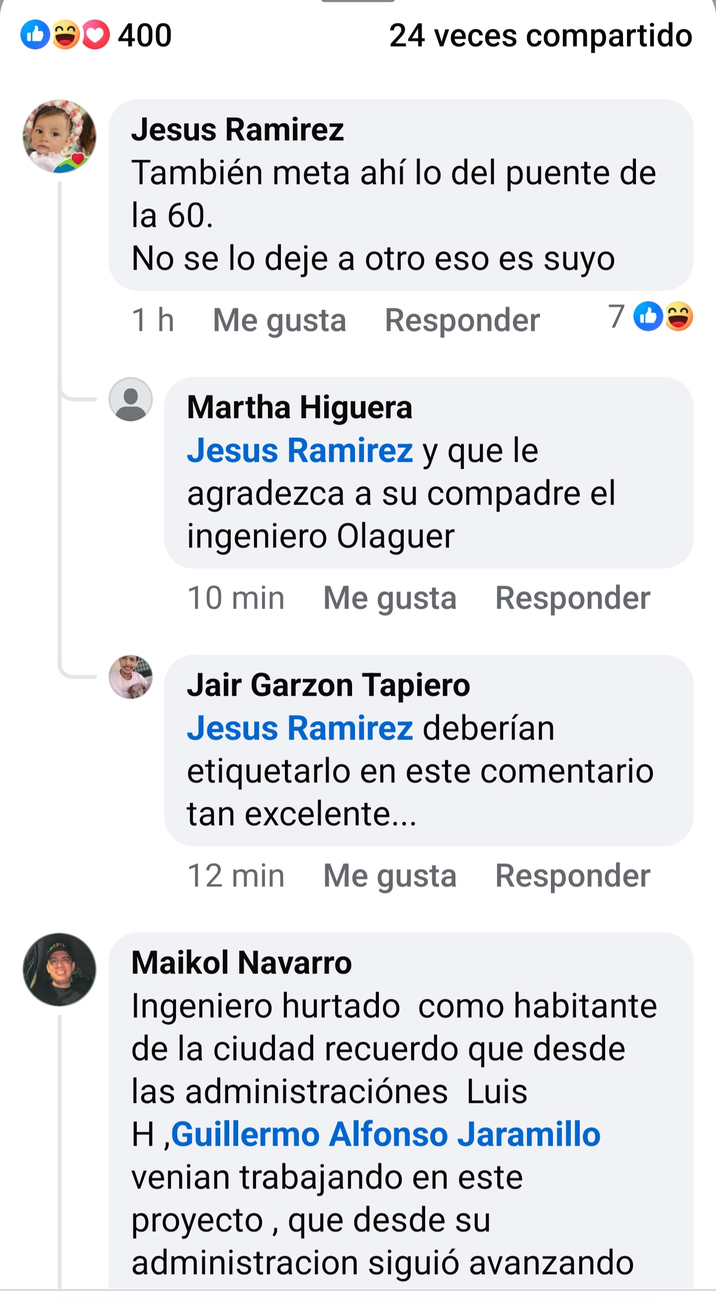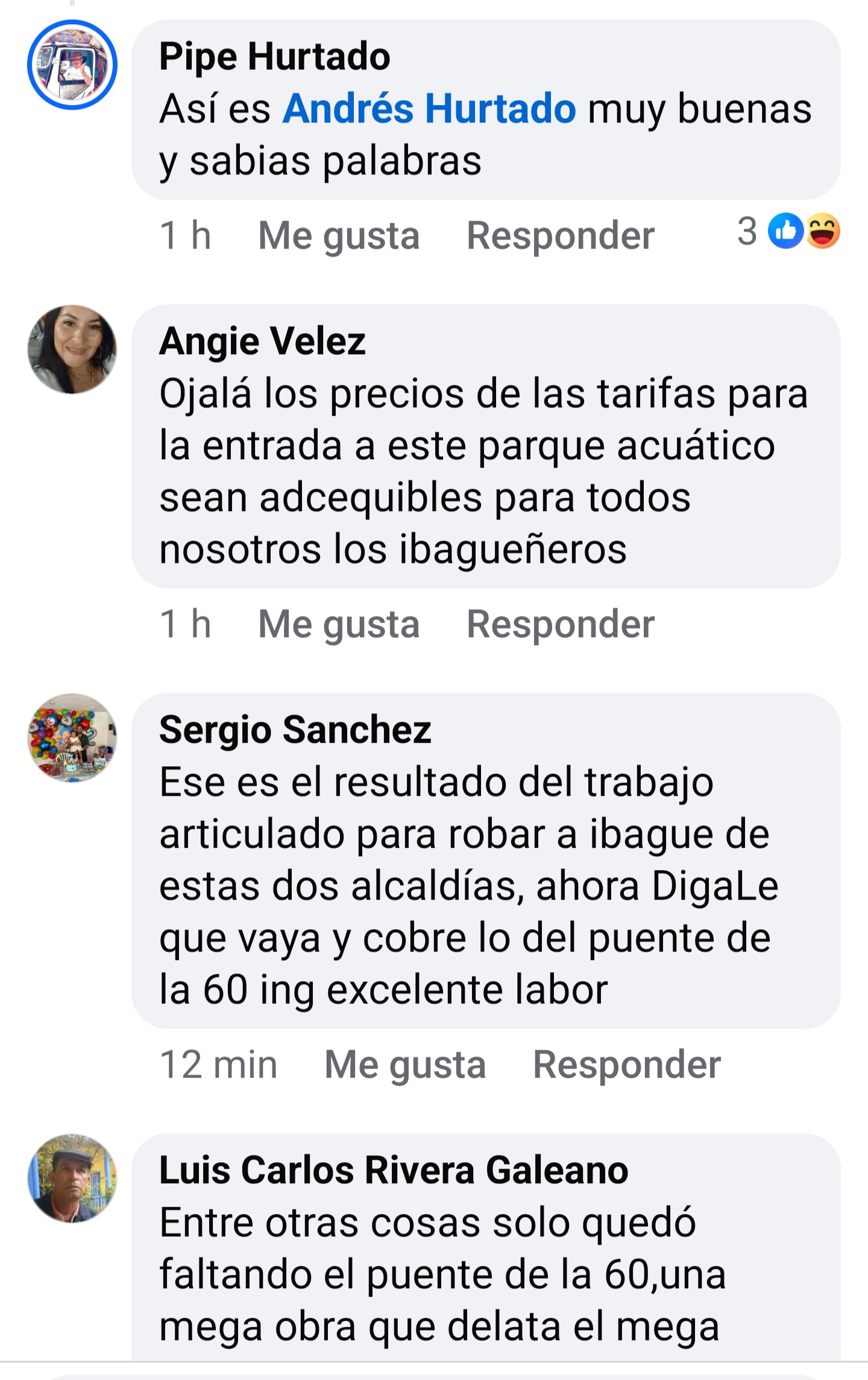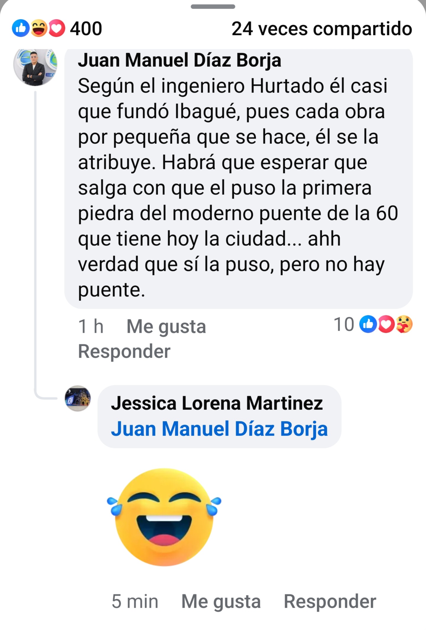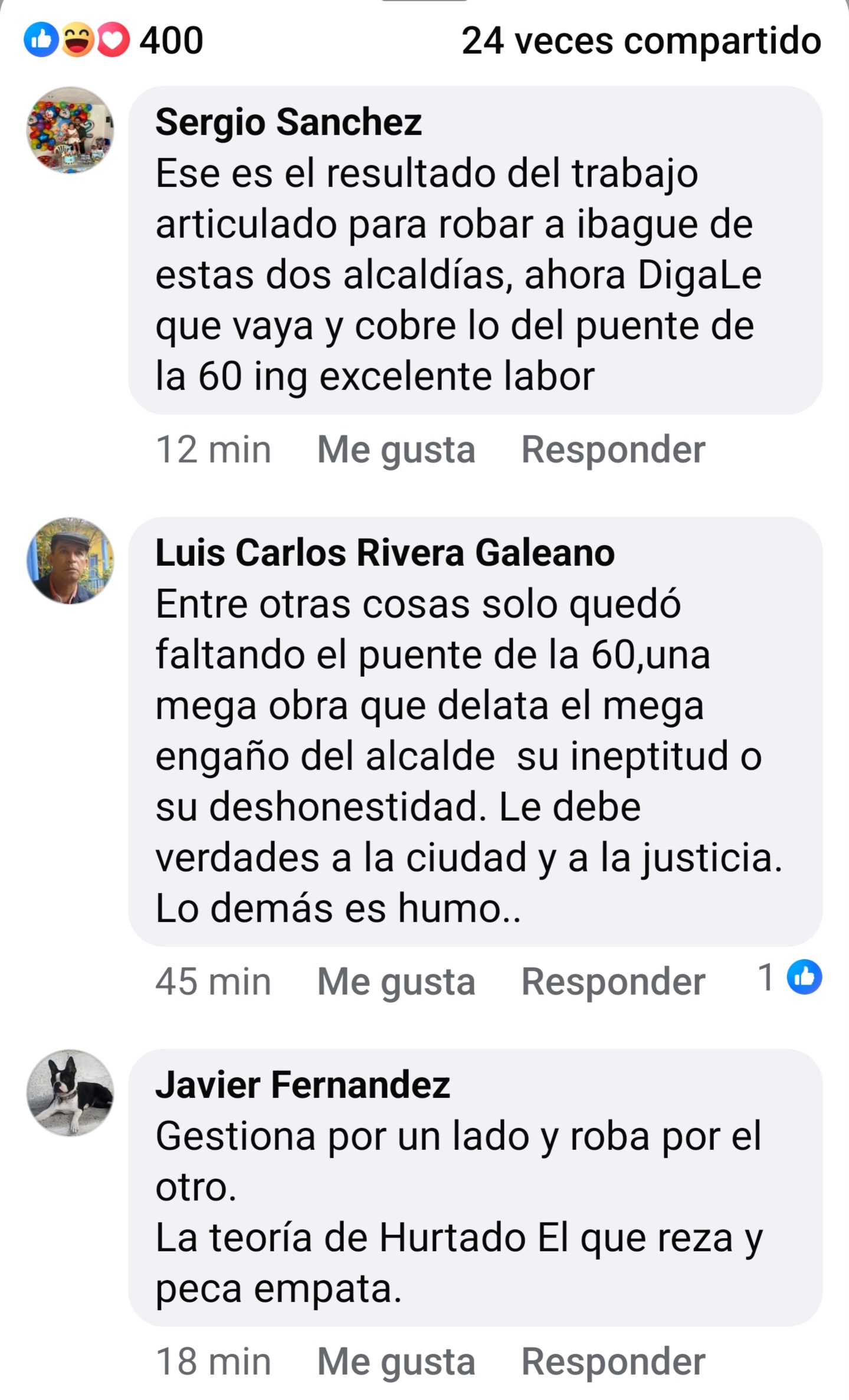 En los comentarios que realizaron las personas a la publicación de Hurtado en Facebook, es el fiel reflejo que la gente ha visto que lo único que dejo es administración fueron unos entuertos, como el puente de la calle 60 con carrera 5 de Ibagué, el fantasma, que nunca se hizo, porque lo que dejó el gobierno Hurtado, fue un dolor de cabeza.