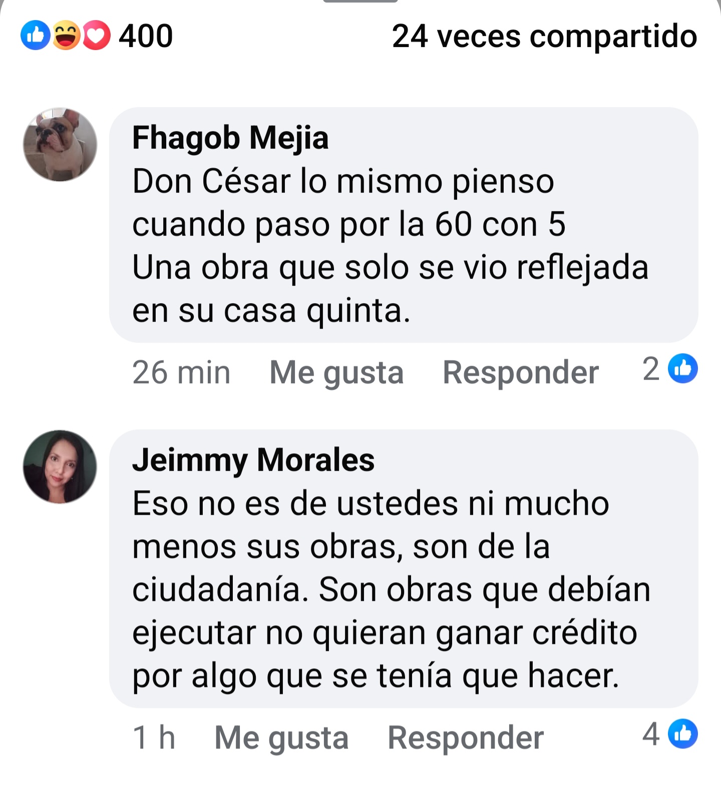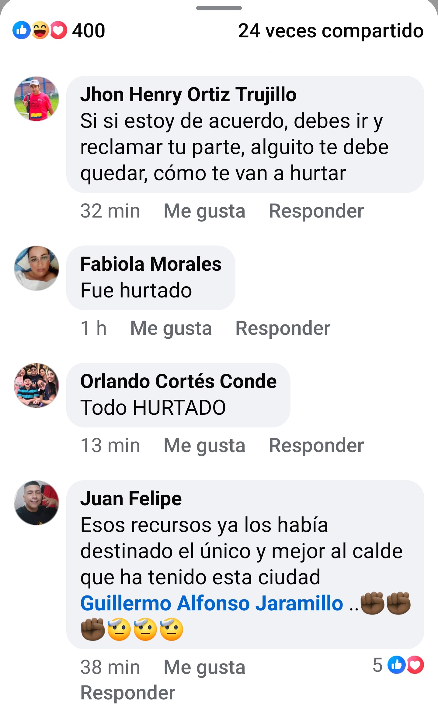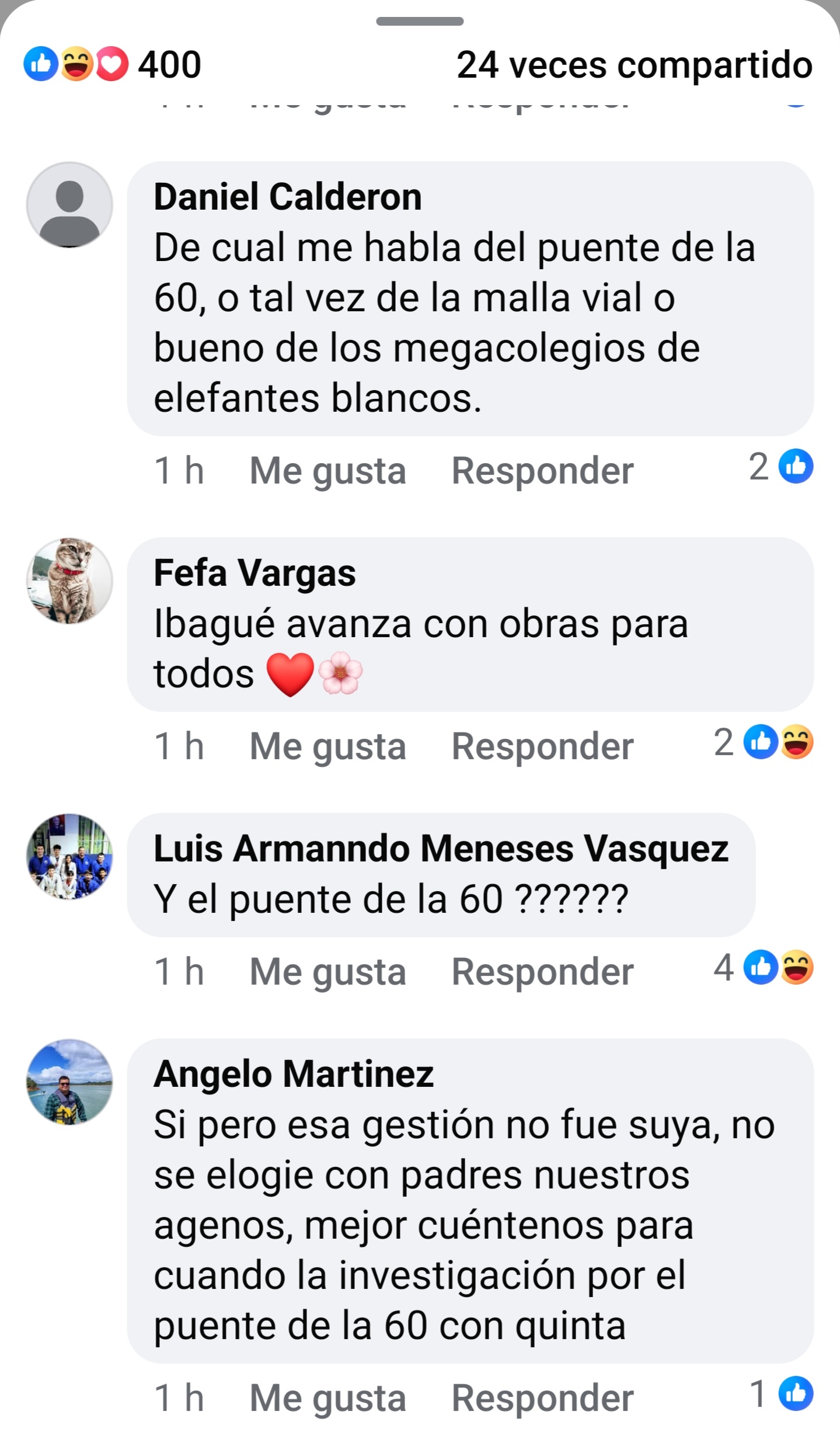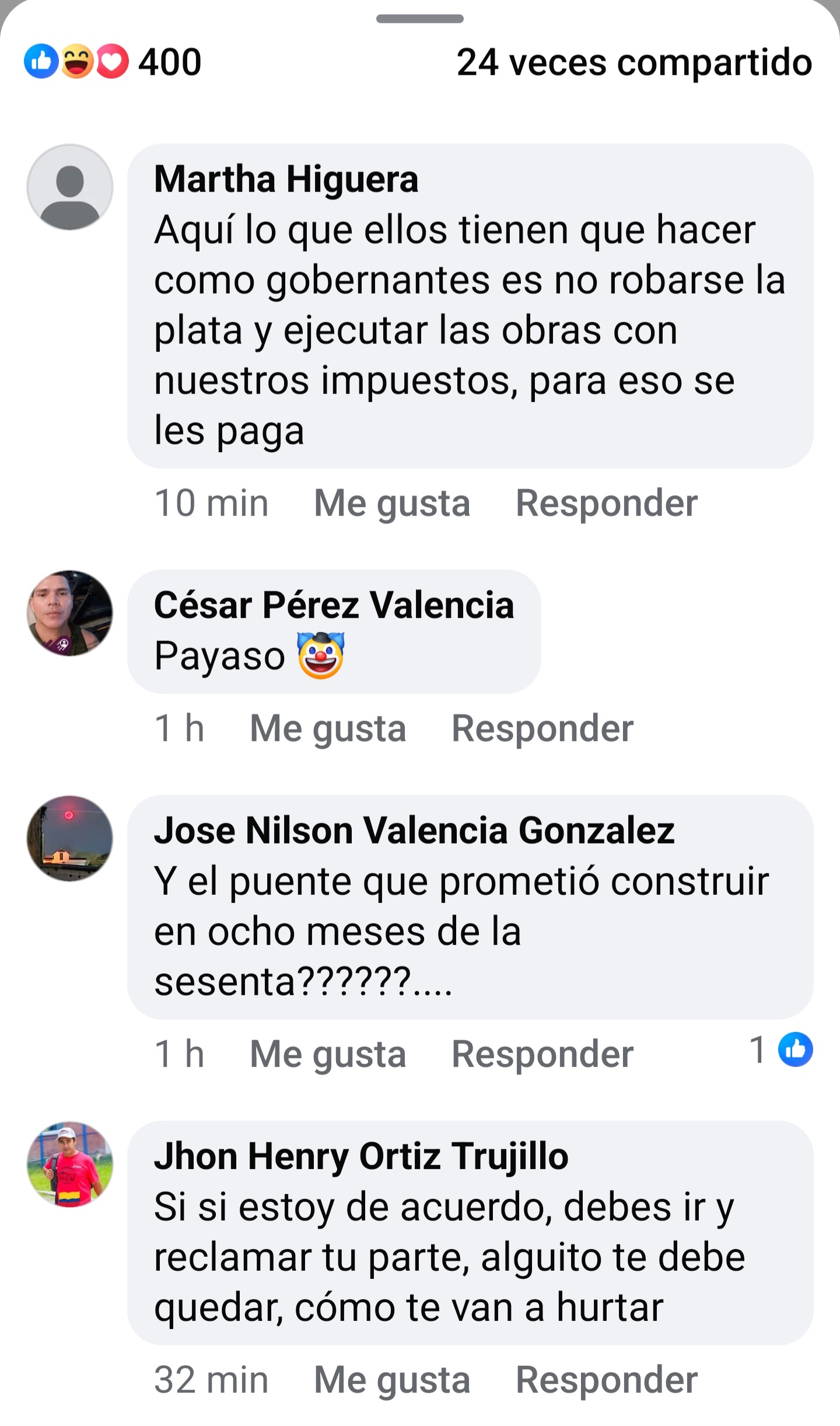 En los comentarios que realizaron las personas a la publicación de Hurtado en Facebook, es el fiel reflejo que la gente ha visto que lo único que dejo es administración fueron unos entuertos, como el puente de la calle 60 con carrera 5 de Ibagué, el fantasma, que nunca se hizo, porque lo que dejó el gobierno Hurtado, fue un dolor de cabeza.