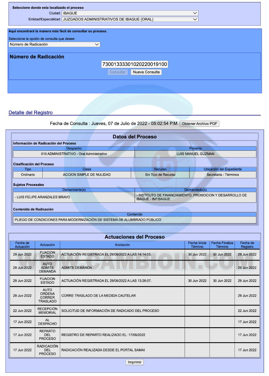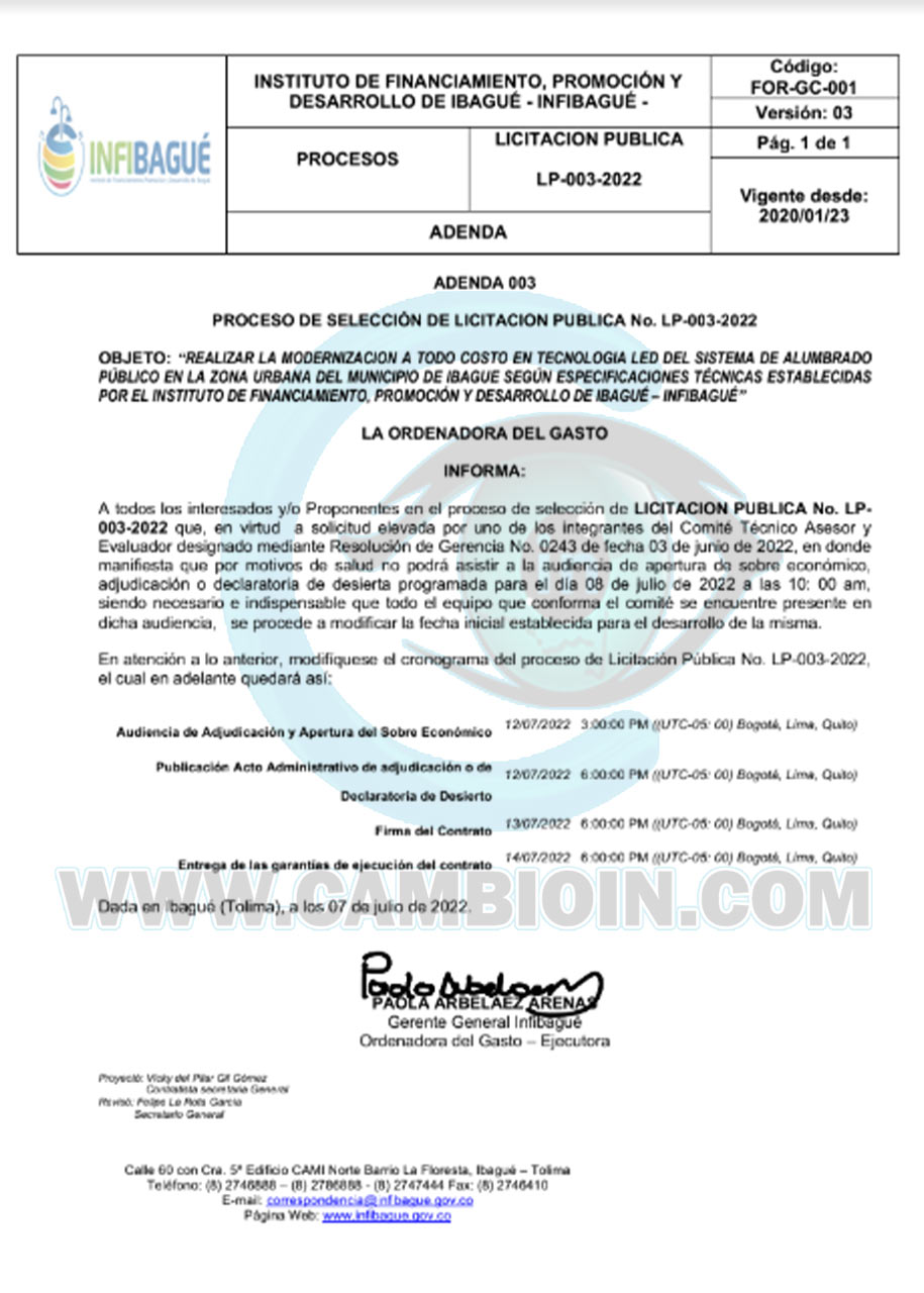Lo que llama la atención es que mientras esto ordena un juez de la república, la gerente dé Infibagué Paola Arbeláez Arenas, sólo aplazó la adjudicación de esa licitación que estaba programada para el día de hoy 8 de julio a las diez de la mañana. La funcionaria sólo expidió un otro sí donde dice que cita para el próximo 12 de julio a las 10 de la mañana, sin tener en cuenta la determinación del juzgado décimo administrativo de Ibagué. (Aplazar la determinación de adjudicar la licitación de la modernización del alumbrado público de Ibagué.)