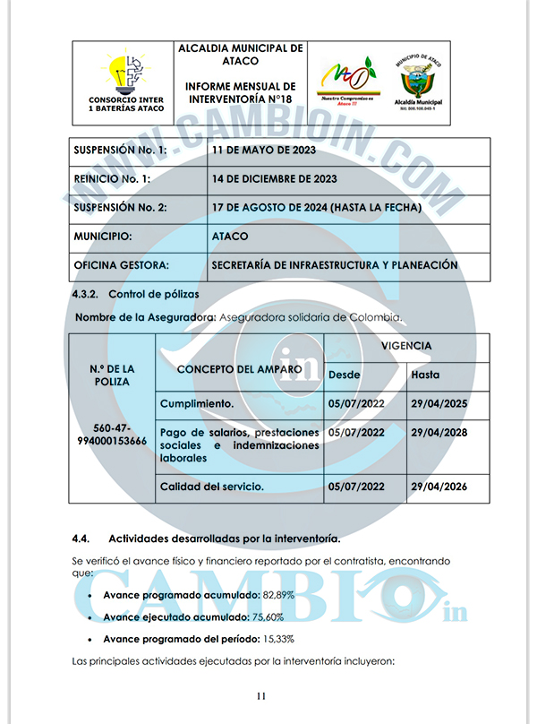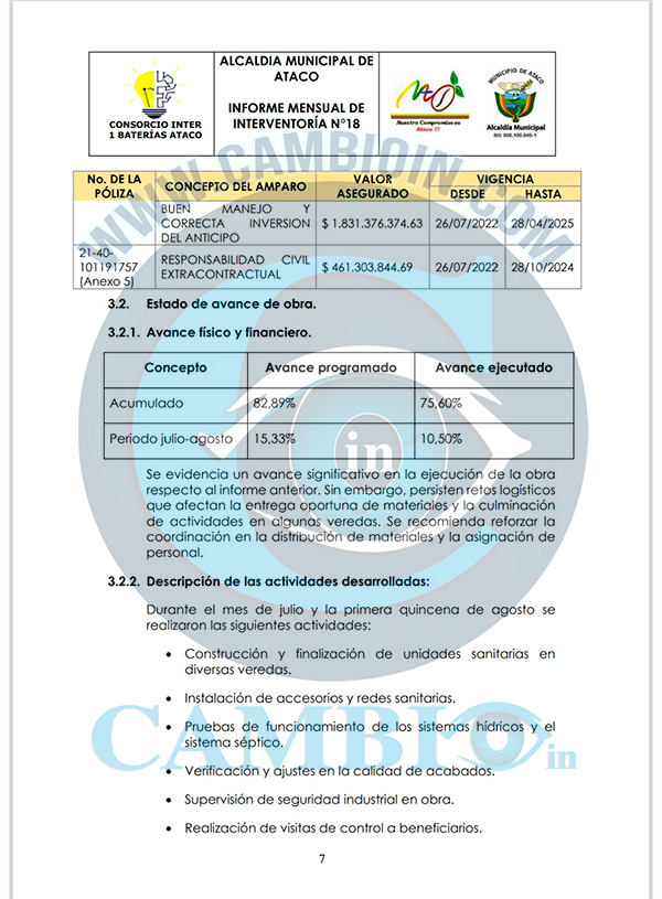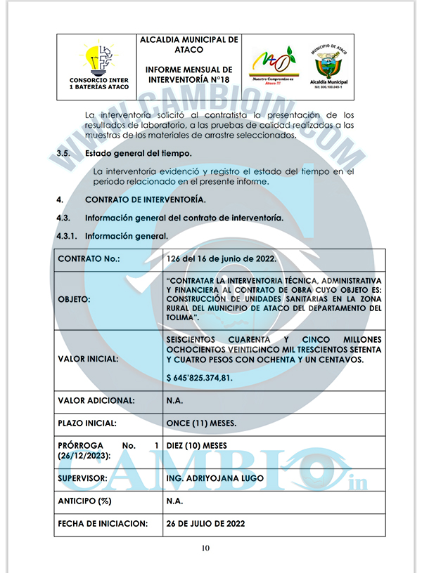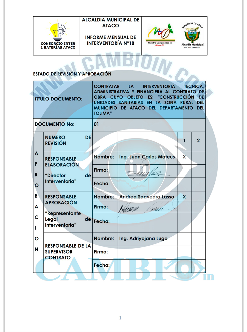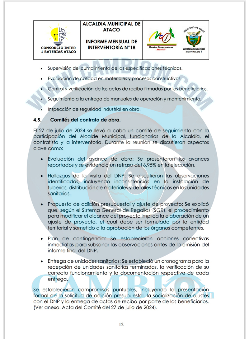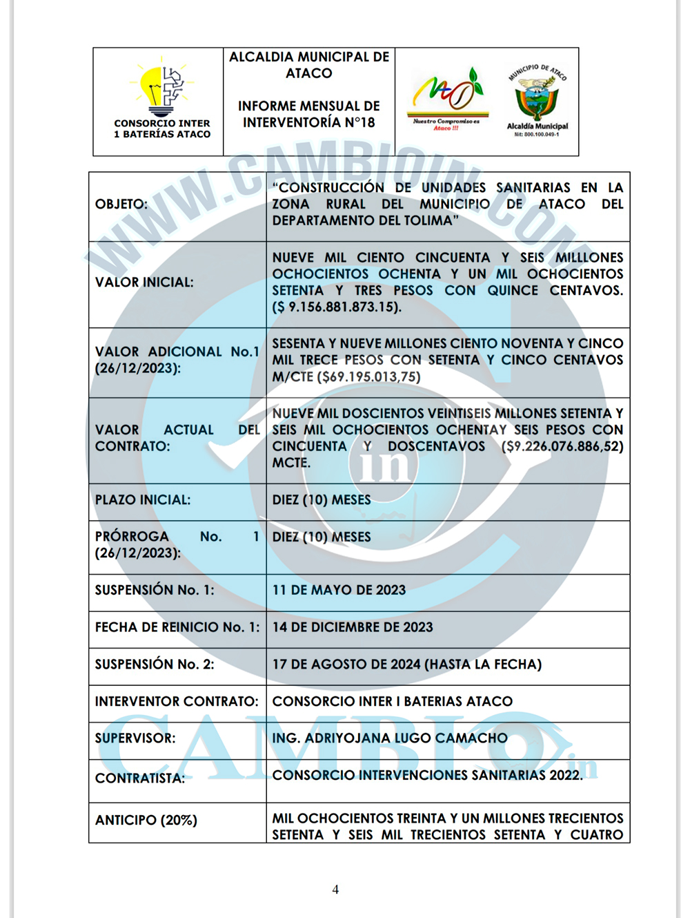 Frente a este caso la denuncia enviada a la Fiscalía General de la Nación, anexa un informe que la alcaldía de Ataco hizo llegar al Concejo, en donde reconocen que a la fecha las unidades sanitarias no se han terminado en su totalidad, por el contrario se presentan inconvenientes, porque se habla de un avance del 75% hasta ahora, algo ilógico cuando va para cuatro años de haberse contratado la obra.