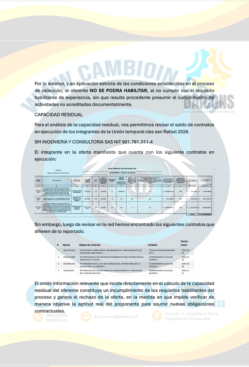 Por lo anterior, se solicita de manera expresa que la Entidad reconsidere el resultado de la evaluación, proceda a habilitar al CONSORCIO SUÁREZ 2026 y continúe con la evaluación integral del proceso, garantizando la correcta aplicación del pliego de condiciones y la protección del interés público.