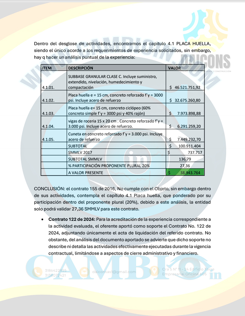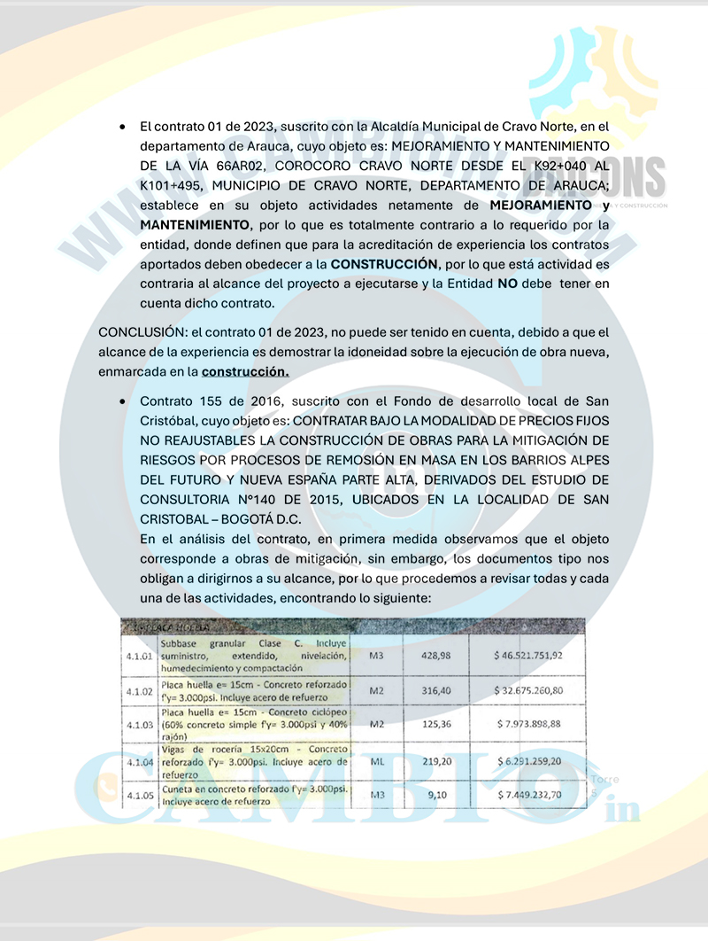 Pese a ser pliego tipo, los calificadores desconocen al Ing. González, para beneficiar a quien no ofrecerá documentos que validen su experiencia, y que los contratos aportados no son en construcción en pavimento rígido, tal como lo hace saber el otro oferente en las observaciones a la calificación.