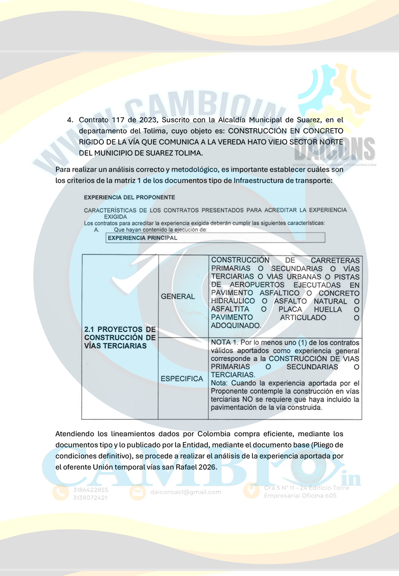 En particular, se ha evidenciado que la evaluación de la capacidad residual realizada por la Entidad se aparta de la metodología legal y contractual, al incorporar criterios ajenos a su naturaleza financiera, como lo son la forma de vinculación del personal y la oportunidad de los aportes a seguridad social, los cuales, además, no se encontraban legalmente exigibles al momento de la presentación de la oferta. Asimismo, se ha demostrado que el Consorcio SUÁREZ 2026 sí acredita experiencia general y específica en construcción de vías, conforme a los lineamientos técnicos del proceso, a la clasificación de vías prevista en el pliego y a la interpretación funcional que exige la normativa vigente, sin que exista fundamento jurídico para desconocer la equivalencia técnica de los contratos aportados.