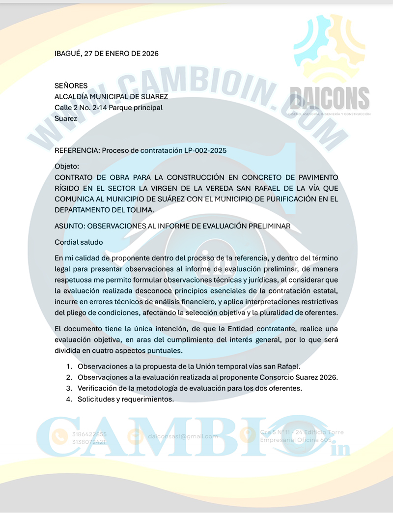 La Administración de Suárez, pretende imponer un contratista de su preferencia, desconociendo los principios esenciales de la contratación en una licitación para la construcción en concreto pavimento rígido de un sector de la vía Suárez- Purificación. A la licitación, cuyo valor es superior a los mil millones de pesos, sólo se presentaron dos contratistas. En la evaluación preliminar los calificadores desconocieron al Consorcio Suárez 2026, representado por el Ing. Carlos Andrés González, para dejar como único oferente a La Unión Temporal Vía San Rafael.