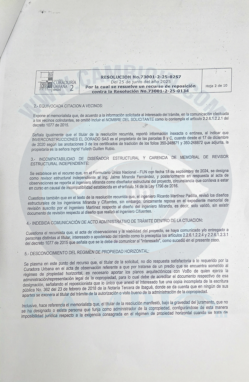 Copia 2: Secretaria de Planeación de Ibagué, ratificó qué la licencia se concedió mal. Exclusivo cambioin.com
