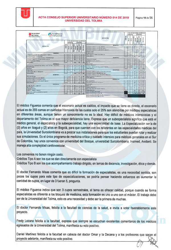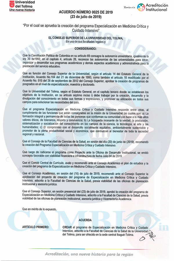 Resulta que el 23 de julio de 2019 fue aprobado por el consejo superior de la Universidad del Tolima, la creación de la Especialización en Medicina Crítica y Cuidado Intensivo, lo cual fue una noticia que fue muy bien recibida puesto que era para ese entonces la primera especialidad de ese tipo que iba a ser ofertada por una universidad de la región, lo que se veía como una oportunidad para los médicos de la región los cuales podrían especializarse sin tener que ir a otra parte del país, a partir de ese momento la universidad debía iniciar con el trámite del registro calificado para ofertar ese programa.