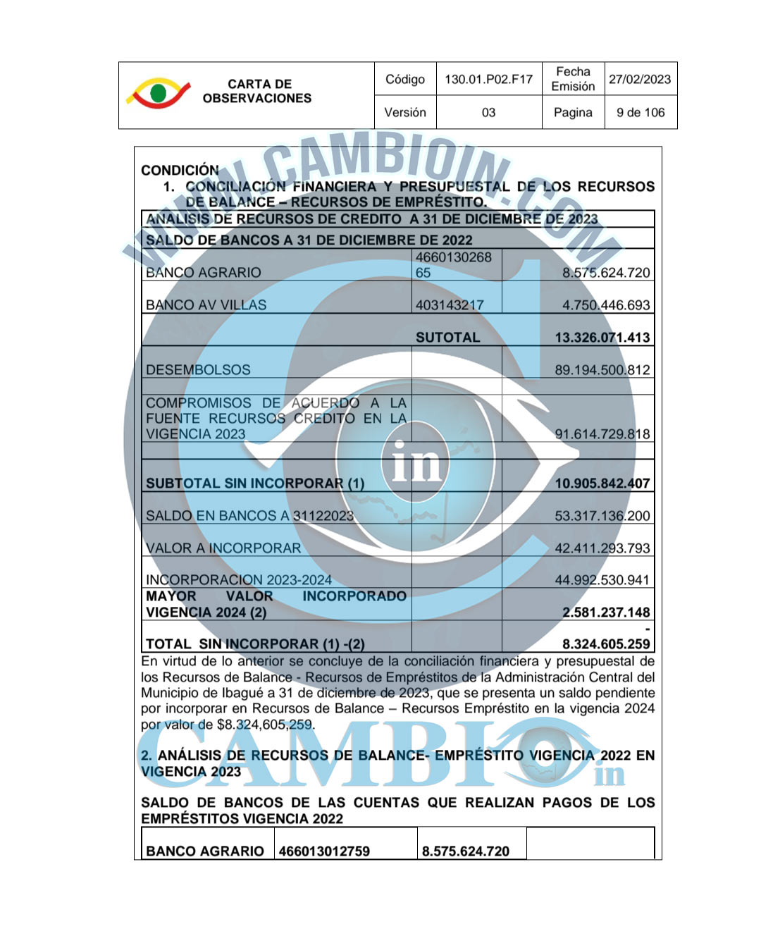 La auditoria especial de la contraloría de Ibagué, puso al descubierto el hallazgo administrativo con incidencia disciplinaria, que significa que deberá ser enviada a la Procuraduría General de la Nación, y Penal qué debe ser remitida a la Fiscalía General de la Nación, en donde señala que durante la vigencia 2023 de una de las cuentas donde se guarda plata adquirida por medio de un empréstito, fueron retirados sin ningún tipo de soporte la suma de 8.324,605,259 de pesos, tampoco fue encontrado por la auditora, a donde fue a para ese dinero.