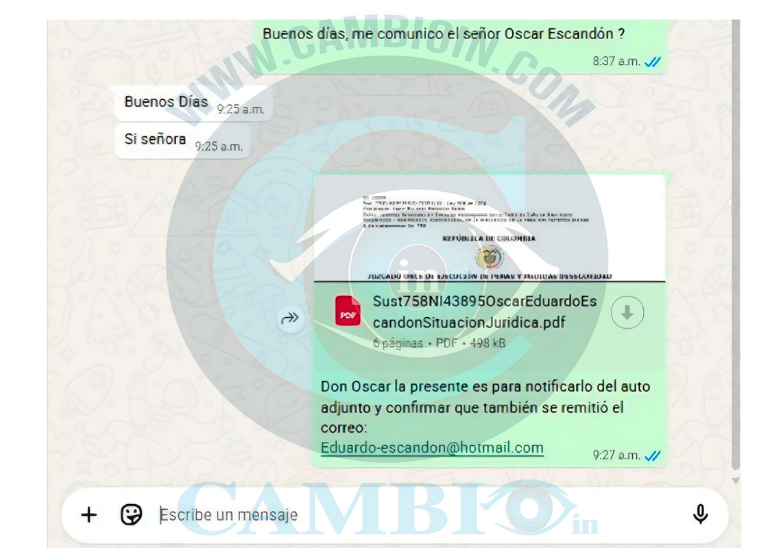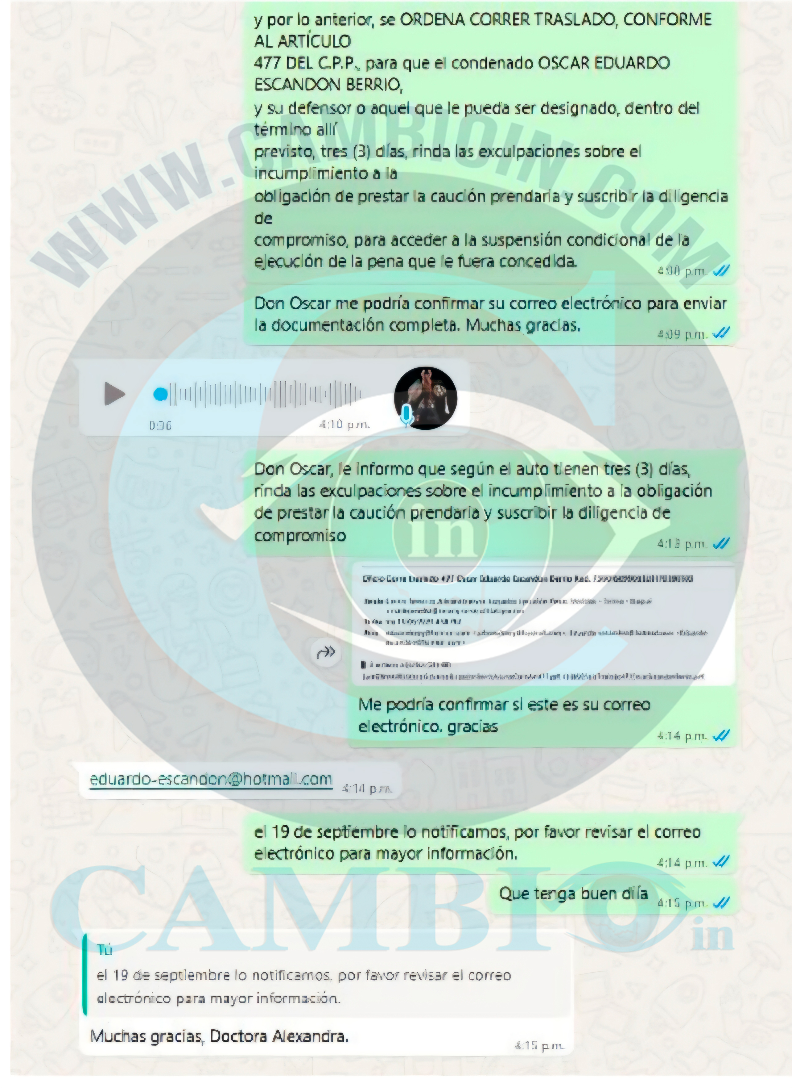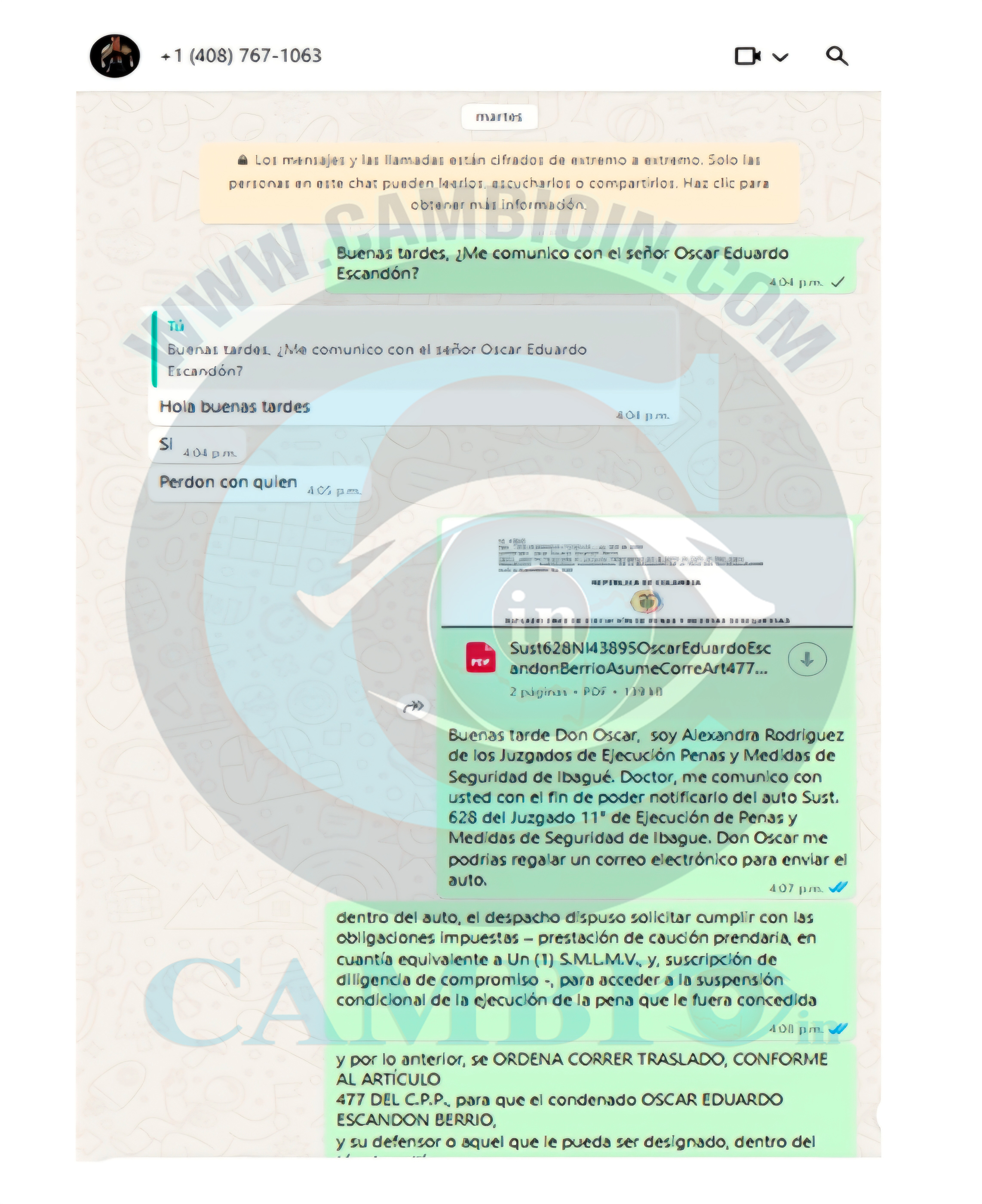 Se deja constancia que, mediante comunicación realizada a través de la aplicación WhatsApp. Se estableció contacto con el doctor Wilson Alexey Vallejo Franco, abogado del señor Óscar Eduardo Escandón Berrio, con el fin de lograr la ubicación del condenado, toda vez que no había sido posible efectuar la notificación del Auto de Sustanciación No. 628. Durante dicha comunicación, el doctor Vallejo informó que el señor Óscar Escandón se encuentra fuera del país y suministró su número telefónico de contacto.