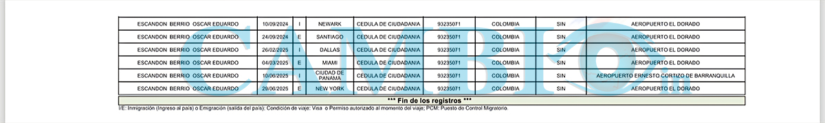 3 salidas del país, con destino a Santiago, Miami y la última hacía New York, con fecha del 29 de junio de 2025, y hasta el 11 de diciembre de 2025, fecha en la que Migración realizó dicho reporte, Escandón Berrío, no había regresado al país.