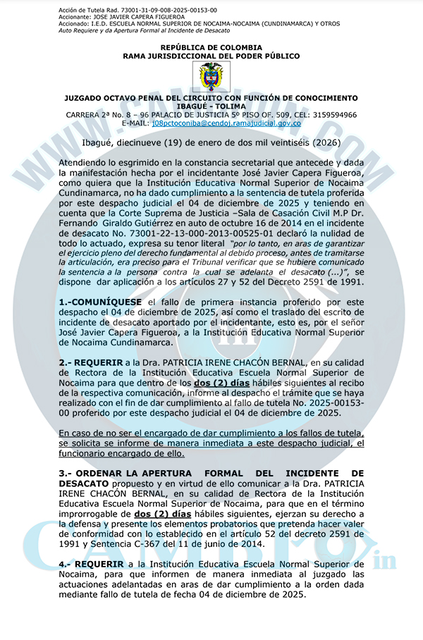 El Juzgado Octavo Penal del Circuito de Ibagué abrió incidente de desacato contra la Normal Superior de Nocaima por NO cumplir un fallo de tutela del 4 de diciembre de 2025 a favor del profesor José Javier Capera.