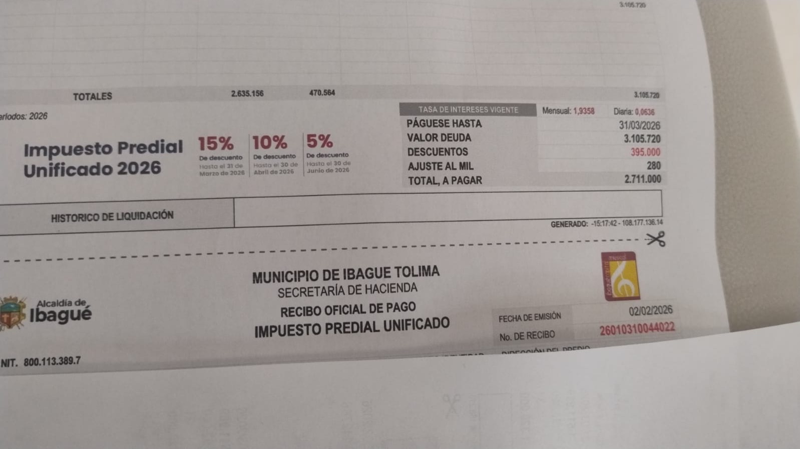 Según la misma alcaldía, los Ibaguereños qué paguen el impuesto predial en los tres primeros meses del año, tendra un descuento del 15% sobre el valor total del gravamen. Pero en primer lugar se puede observar que las tarifas para este año están muy altas, pero al mismo tiempo haciendo una labor fácil de matemática simple se le descuenta el porcentaje anunciado, y se puede ver que en algunas facturas el descuento apenas llega al 10%en algunos casos, porque en otros a lo máximo que sube es al 12% pero en ninguna parte aparece el 15% tasado por una disposición de un acuerdo del Concejo local.