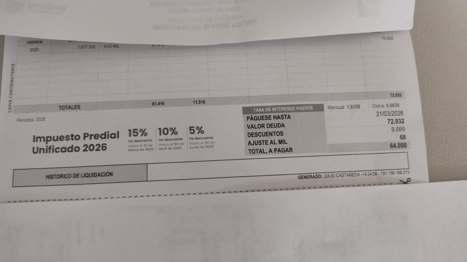 Copias: pruebas del descuento, que no es aplicado a las facturas del impuesto Predial en Ibagué. cambioin.com