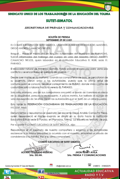 SIMATOL, expidió el siguiente comunicado sobre el fallecimiento del docente: