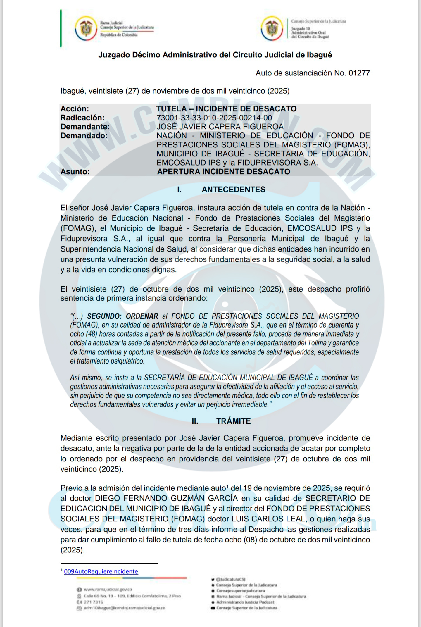 En Ibagué, esa violencia tiene nombre propio: Secretaría de Educación Municipal, bajo la dirección de Diego Fernando Guzmán García. El Juzgado Décimo Administrativo del Circuito de Ibagué no habla con metáforas. Habla con autos judiciales. Y en el Auto de apertura de incidente de desacato (27 de noviembre de 2025) deja algo claro: las entidades accionadas no han acatado la sentencia de tutela del 27 de octubre de 2025. No es una opinión. Es una constatación judicial.