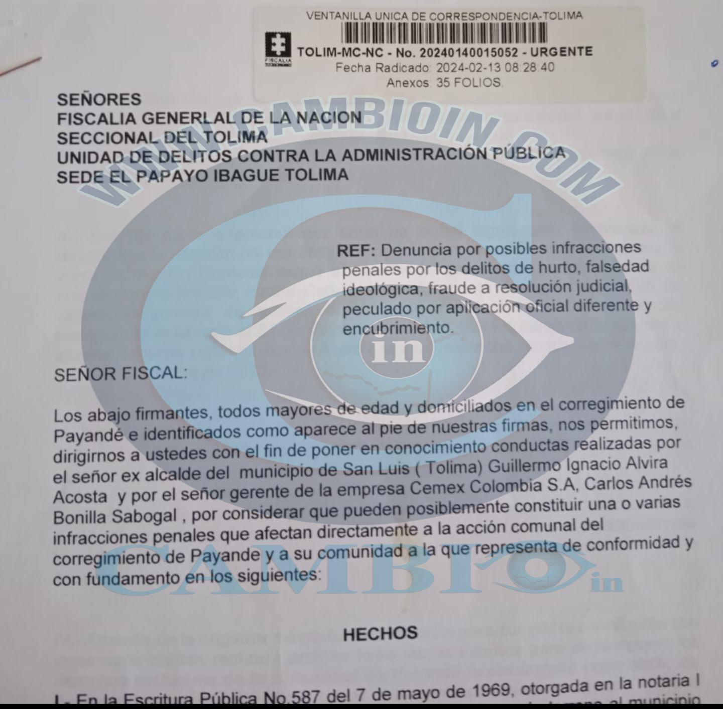 En exclusiva cambioin.com el portal de las noticias conoció copia de una denuncia enviada a la Fiscalía General de la Nación, la cual sirvió de insumo para iniciar un proceso contra el hoy aspirante a la cámara por el Partido Conservador Guillermo Ignacio Alvira Acosta, donde varios ciudadanos lo acusan de haber hurtado, eso dentro de otros delito. Los quejosos han estado pendiente del proceso el cual avanza a paso de tortuga, por eso algunos de los interesados en esta acción tomaron la determinación de hacer público el caso para que el ente acusador lleve a juicio al político qué aspira llegar al congreso.