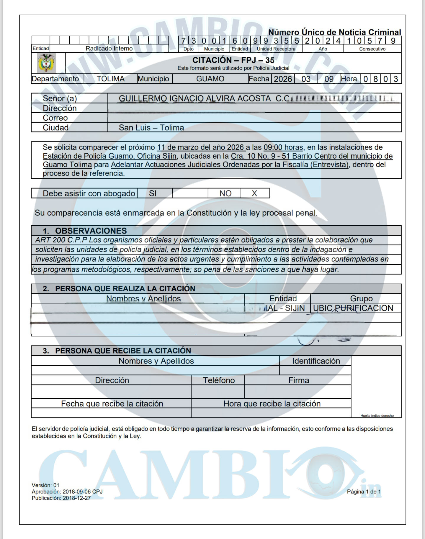 Copia: Citación a Guillermo Ignacio Alvira Acosta, por orden de la fiscalía General de la Nación. cambioin.com