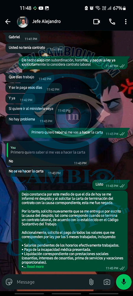 Según testimonios y evidencias conocidas por la comunidad, los trabajadores habrían sido despedidos sin justificación formal, sin entrega de carta de terminación y sin el pago completo de sus derechos laborales, lo que podría constituir una vulneración a lo establecido en el Código Sustantivo del Trabajo.