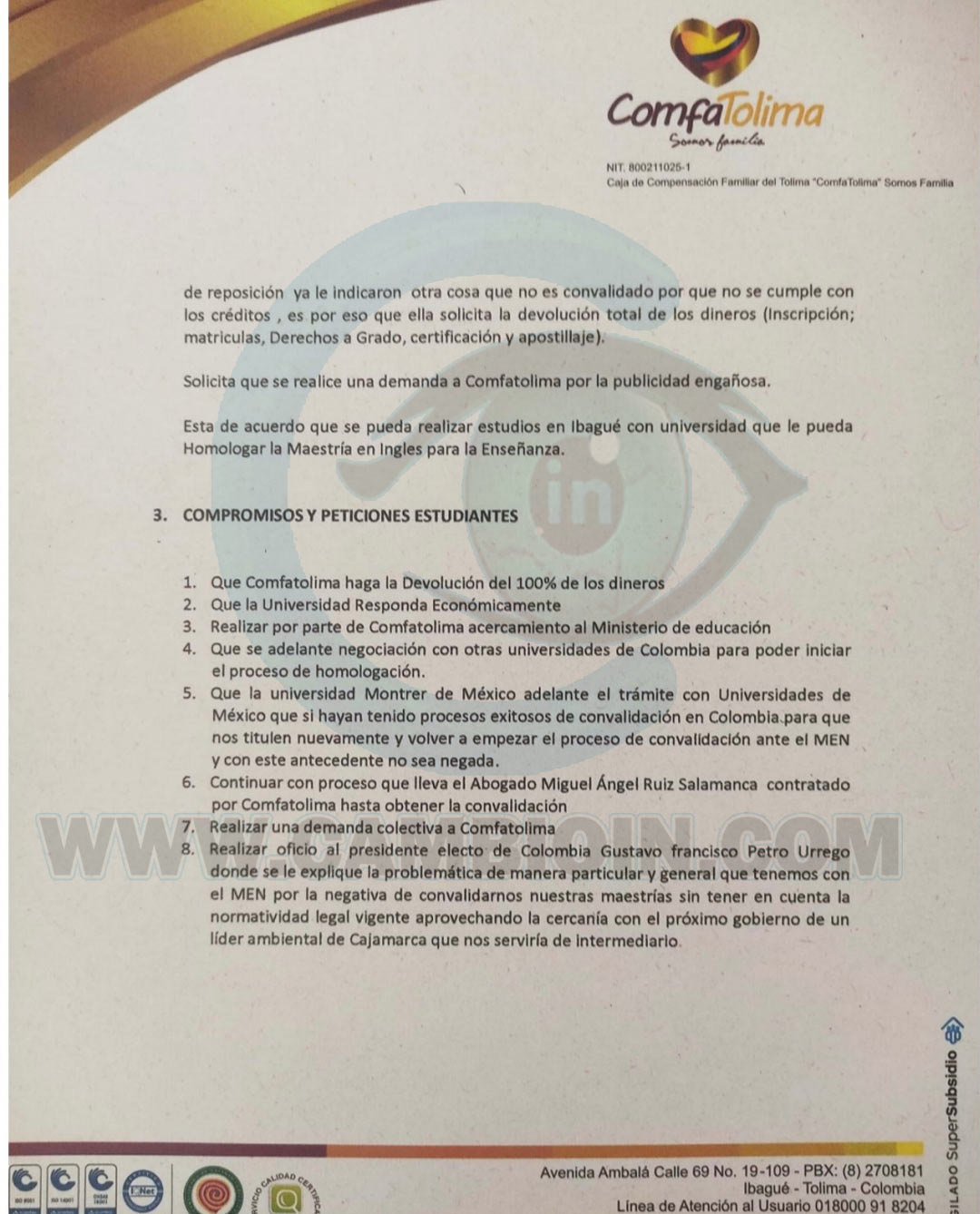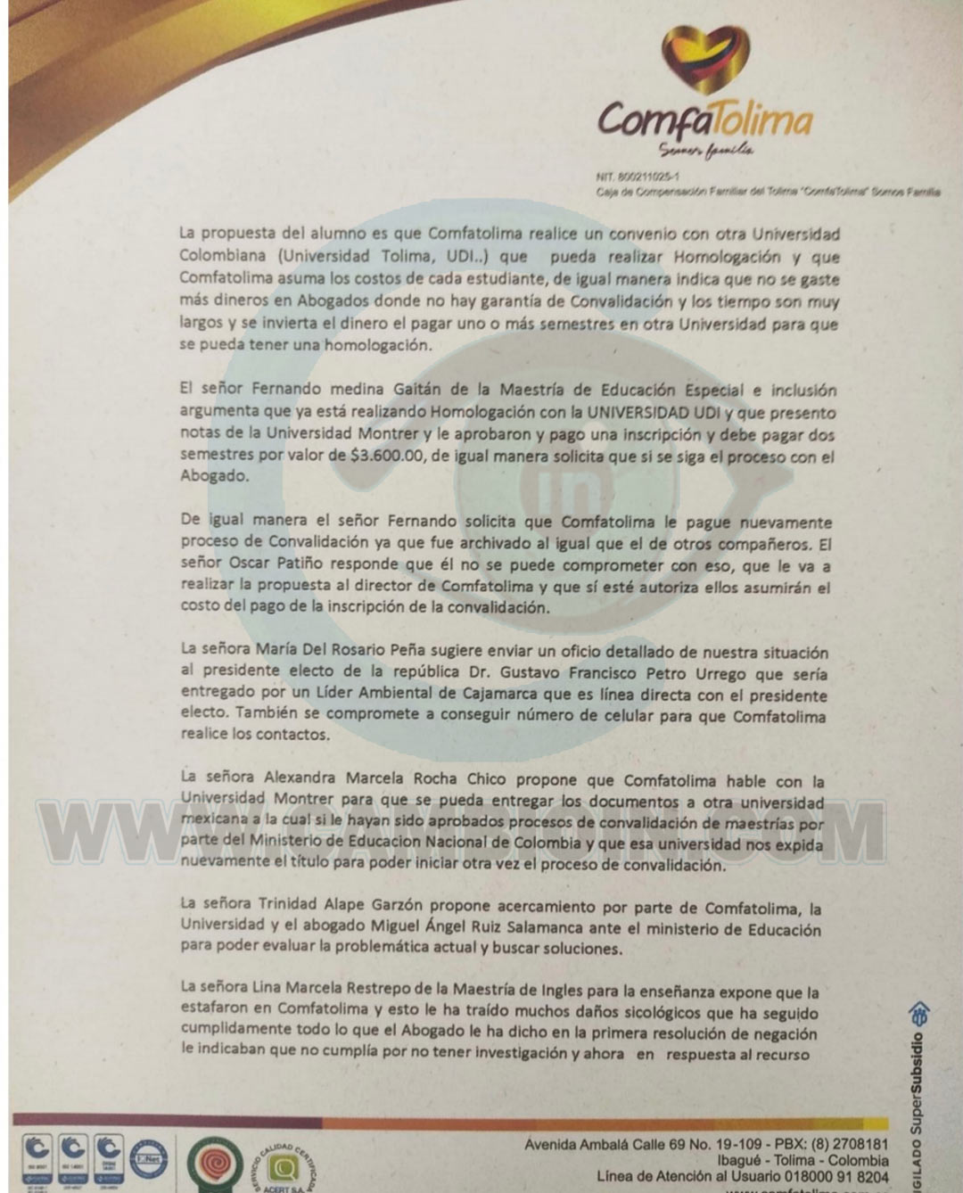 Todas las irregularidades quedaron plasmadas en un acta, que se hizo en hojas que cuentan con sellos de Comfatolima, en uno de los apartes del mismo señala: "Que la responsabilidad Comfatolima ya que al momento de tomar la decisión cada estudiante en hacer una Maestría confió en el respaldo y garantía por ser una caja de Compensación muy prestigiosa en el Tolima, pero que la Universidad Montrer no puede salir a estas alturas que con entregarnos los documentos cumplió porque ellos también son responsables de todo lo que está sucediendo porque en la reunión en Comfatolima donde nos dijeron que las maestrias eran convalidables asistió el rector de la universidad". (acta donde están plasmadas las irregularidades)
