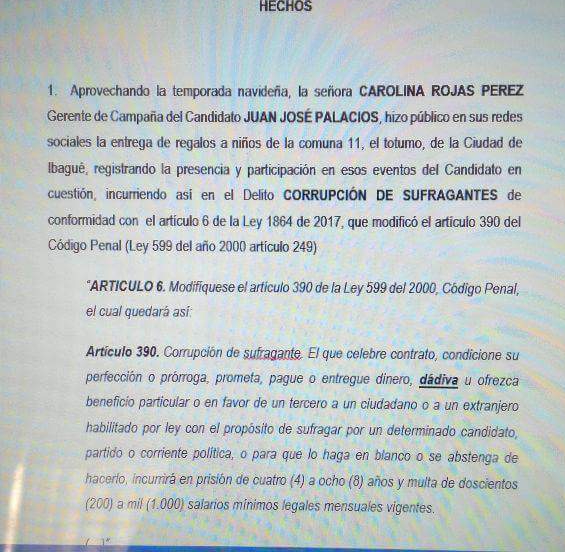 Según el quejoso, los mencionados habrían violado el código penal Colombiano en su modificado artículo 390 de la ley 599 del año 2000, que habla sobre la corrupción del sufragante o elector, en el mismo se castiga con prisión de 4 a 8 años de cárcel y multas de doscientos hasta mil salarios mínimos mensuales legales vigentes, a quien celebre contratos condicione su perfección o prórroga, prometa, pague o entregue dinero, dádiva u ofrezca beneficio particular o en favor de un tercero (...) a sufragar por un determinado candidato, partido o corriente política o para que vote en blanco o se abstenga.